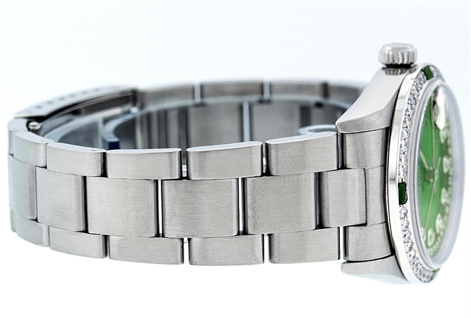 One Midsize Stainless Steel Rolex Datejust Polished, Serviced & Electronically Tested, Stainless Steel Case Case:31mm, Stainless Steel Crown, Custom Bezel: 18K White Gold Emerald Beadset Bezel, Diamond Count: 40 Diamonds + 4 Emeralds, Total Weight: 1 Carat, Color: G To H, Clarity: VS2-SI1. Custom Crystal: Synthetic Sapphire Cyclops Lens. Movement: Automatic Winding Movement Caliber 2235. Custom Dial: Green Vignette Diamond Dial VVS. Color: G to H, Clarity: VVS, Date Window: 3 O'Clock Position Date Display, Quickset, Model: Midsize Datejust. Condition: G-6 Extra Fine The Watch Is In Very Good Condition Free Of All Scratches And Dents. Bracelet: Stainless Steel Oyster Band. Bright Polish. 6.0 Inch Length, Adjustable. Standard Clasp, With Rolex Logo. Comes with 6 month warranty.