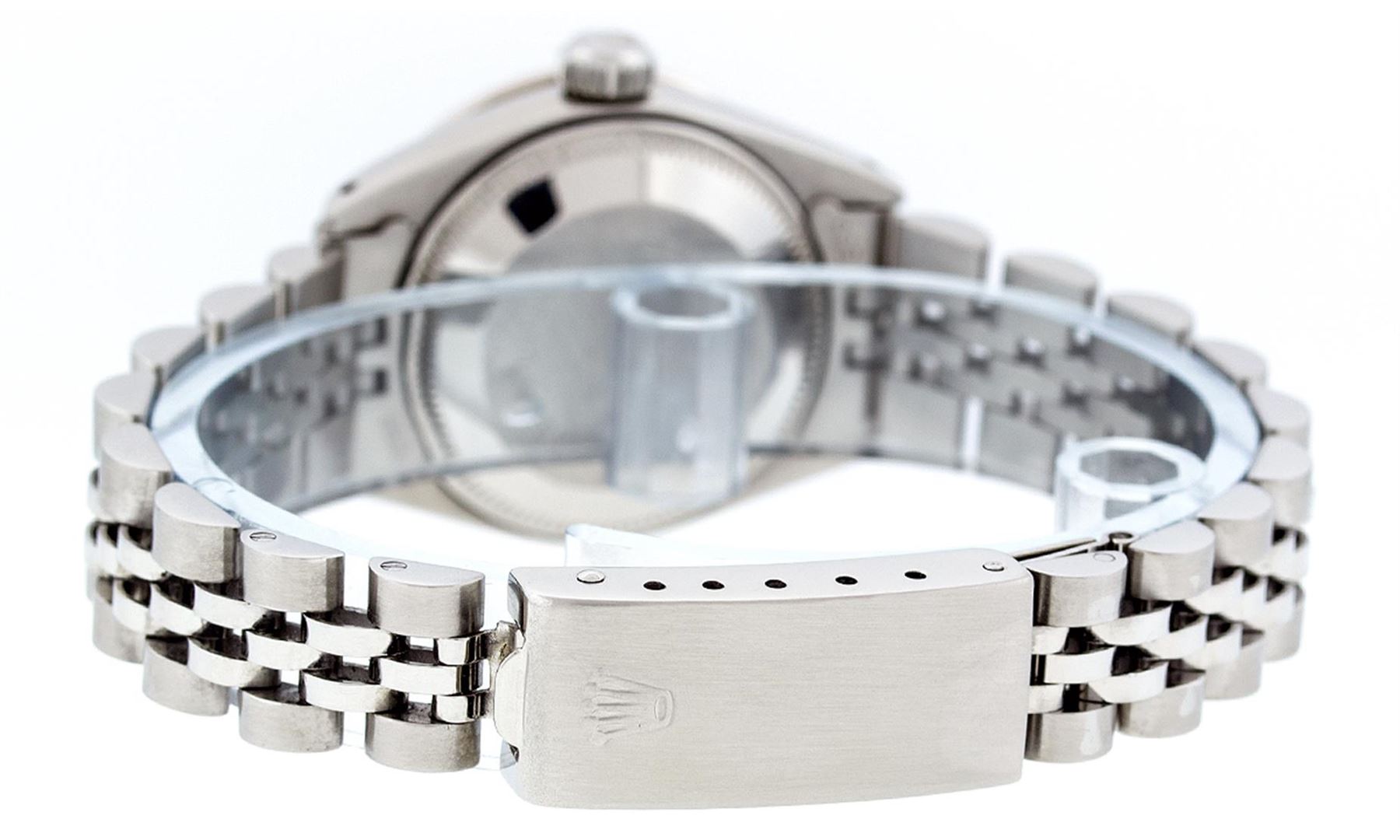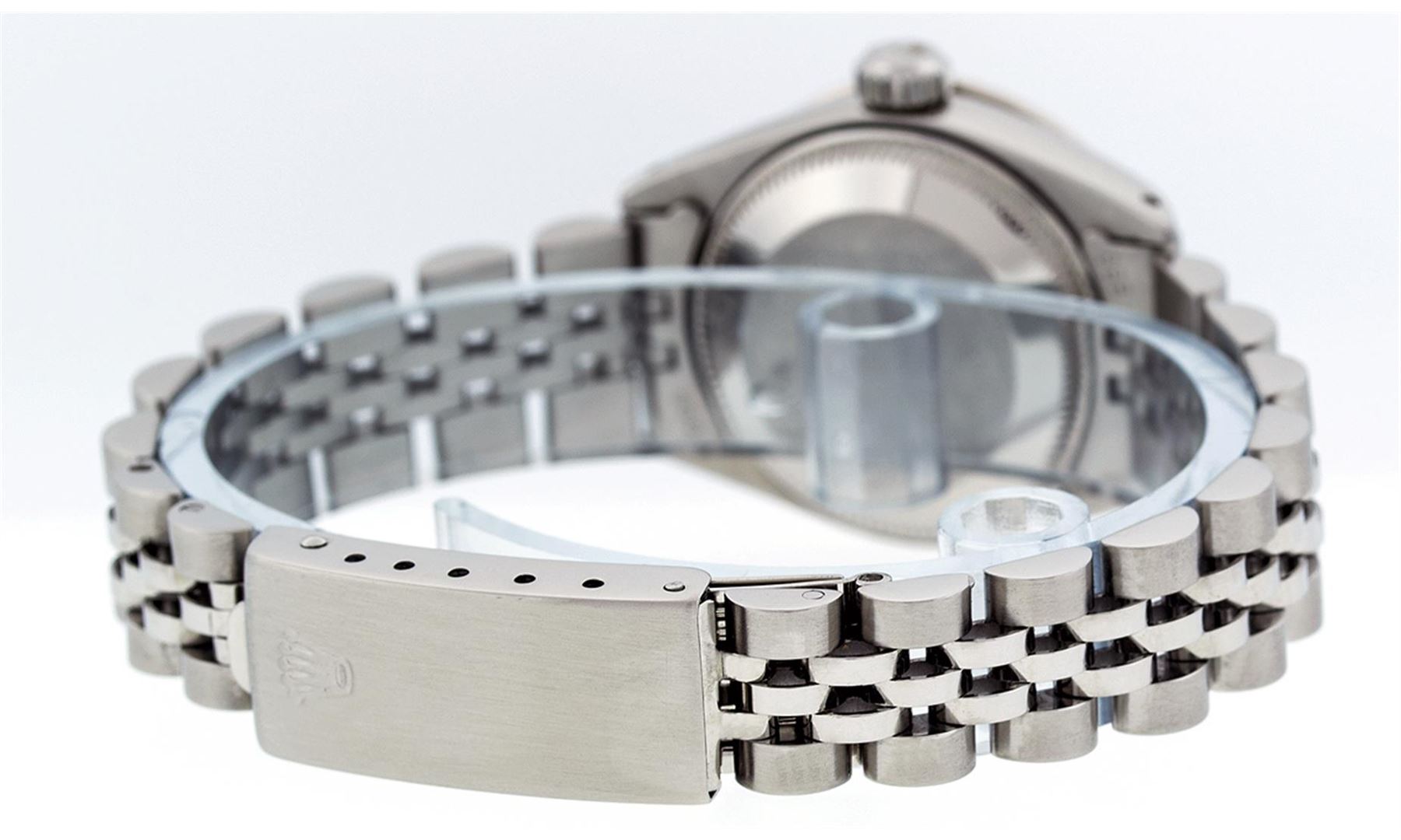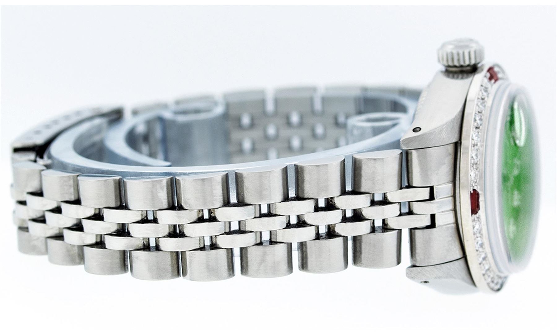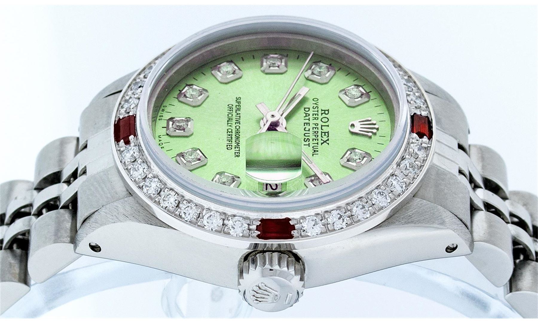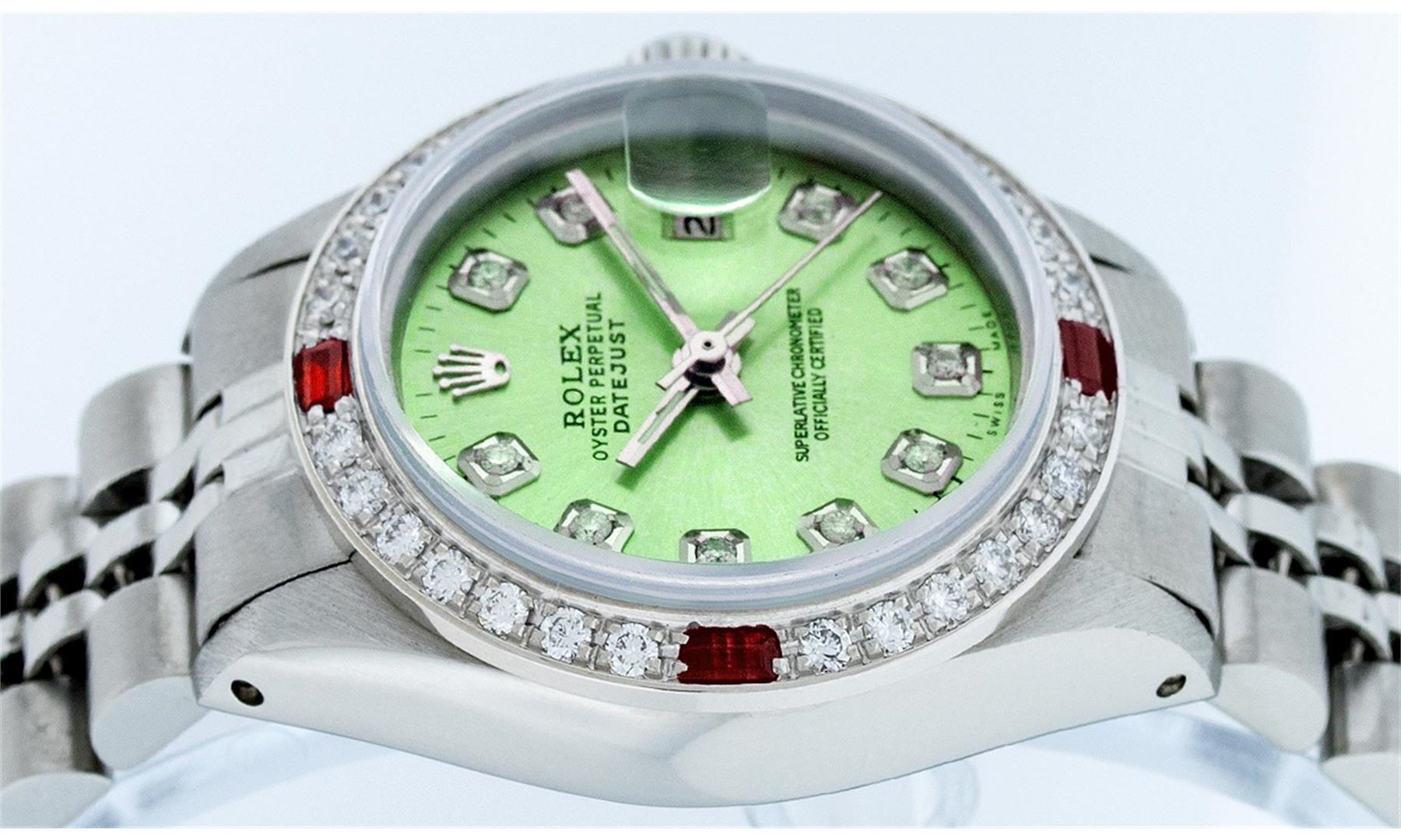 Ladies Rolex Datejust Polished Bright with Satin Finish, Serviced & Electronically Tested, Stainless Steel Case:26mm, Stainless Steel Crown, Custom Bezel: 18K White Gold Ruby Beadset Diamond Bezel, Diamond + Gem Count: 28 Diamonds + 4 Ruby. Total Weight .70 Carat, Clarity: SI-VS, Color: G to H. Custom Crystal: Synthetic Sapphire Cyclops Lens. Movement: Automatic Winding Movement Caliber 2030. Custom Dial: Refinished Ice Green With Diamond Hour Markers. Diamond Count: 10 Diamonds, Color: G To H, Clarity: SI-VS. Date Window: 3 O'Clock Position Date Display, Model: Datejust. Condition: G-6 Extra Fine. Bracelet: Stainless Steel Jubilee. Bright Polish & Satin Finish. 6.0 Inch Length, Adjustable. Standard Clasp, With Rolex Logo. Comes with 6 month warranty.