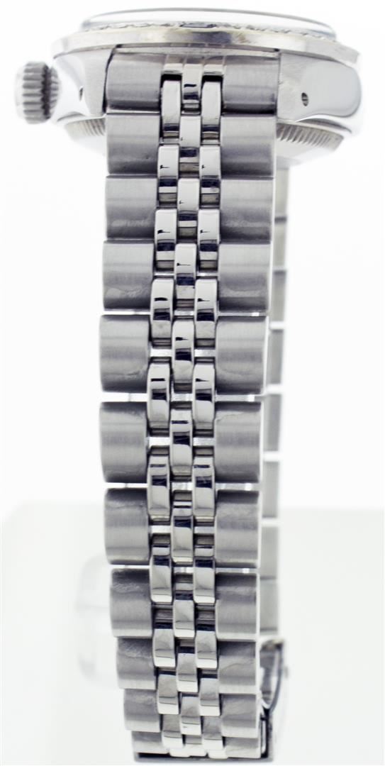 One Ladies Rolex Datejust Polished Bright with Satin Finish, Serviced & Electronically Tested, Stainless Steel Case:26mm, Stainless Steel Crown, Custom Bezel: 18K White Gold Sapphire Beadset Diamond Bezel, Diamond Count: 28 Diamonds + 4 Sapphires Total Weight .70 Carat, Clarity: SI-VS, Color: G to H. Custom Crystal: Synthetic Sapphire Cyclops Lens. Movement: Automatic Winding Movement Caliber 2030. Custom Dial: Ice Blue Diamond Dial, Diamond Count: 10 Diamonds In Dial, Clarity: SI-VS, Color: G to H. Date Window: 3 O'Clock Position Date Display, Quickset, Model: 6917 Condition: G-6 Extra Fine. Bracelet: Stainless Steel Jubilee Band. Bright Polish & Satin Finish. 5.5 Inch Length, Adjustable. Standard Clasp, With Rolex Logo.