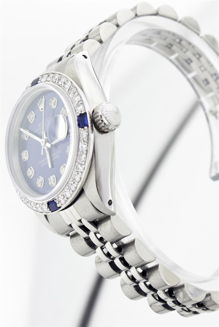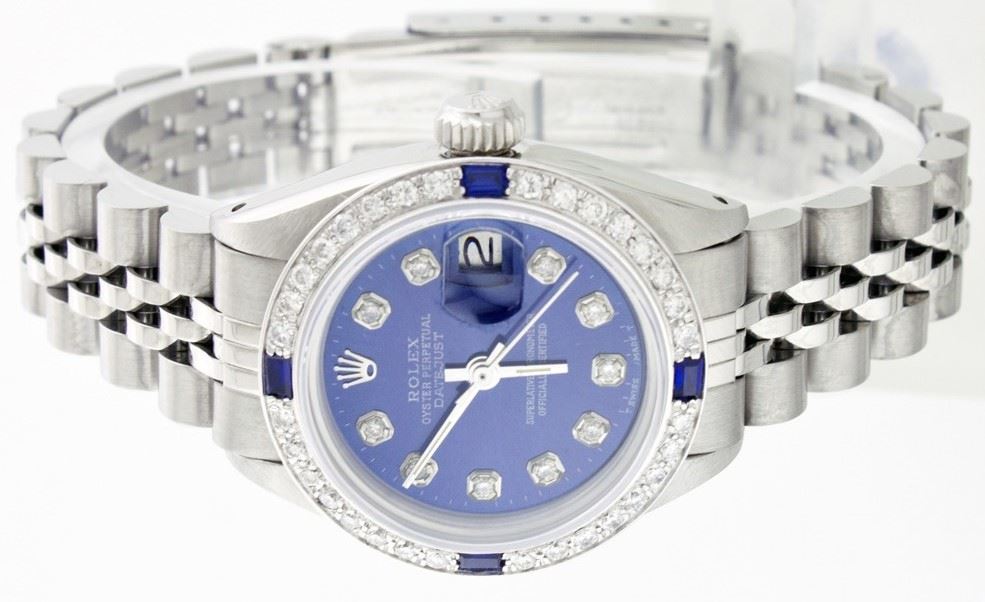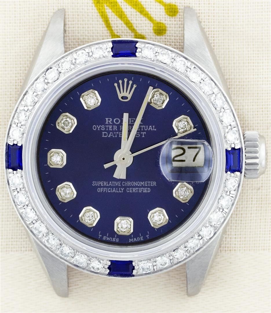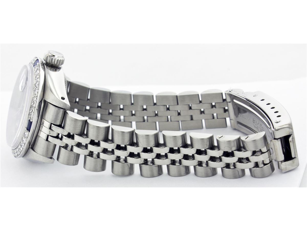 One Ladies Rolex Datejust Polished Bright with Satin Finish, Serviced & Electronically Tested, Stainless Steel Case:26mm, Stainless Steel Crown, Custom Bezel: 18K White Gold Sapphire Beadset Diamond Bezel, Diamond Count: 28 Diamonds + 4 Sapphires Total Weight .70 Carat, Clarity: SI-VS, Color: G to H. Custom Crystal: Synthetic Sapphire Cyclops Lens. Movement: Automatic Winding Movement Caliber 2030. Custom Dial: Blue Diamond Dial, Diamond Count: 10 Diamonds In Dial, Clarity: SI-VS, Color: G to H. Date Window: 3 O'Clock Position Date Display, Quickset, Model: 6917 Condition: G-6 Extra Fine. Bracelet: Stainless Steel Jubilee Band. Bright Polish & Satin Finish. 5.5 Inch Length, Adjustable. Standard Clasp, With Rolex Logo.