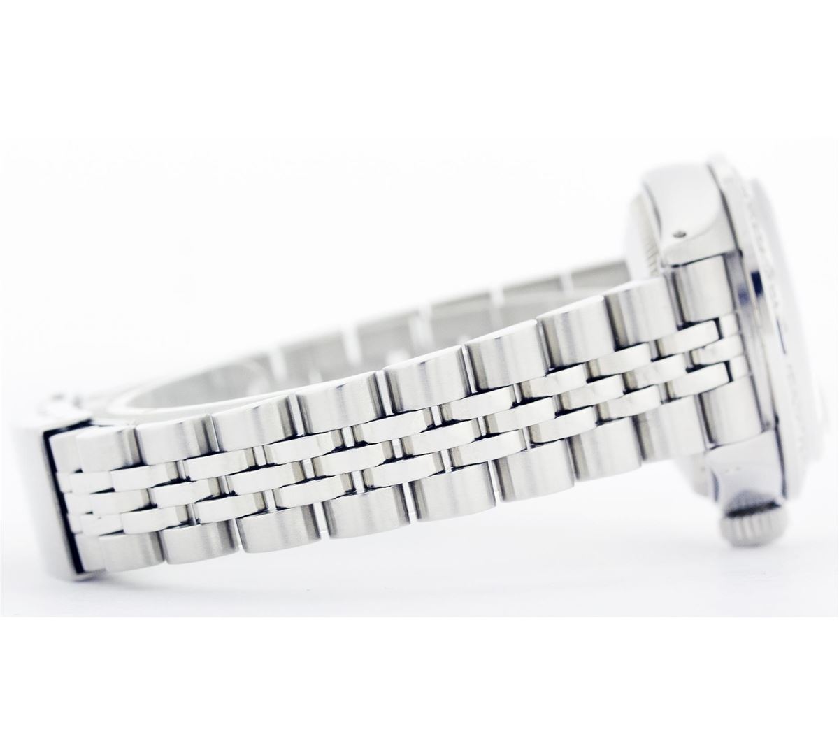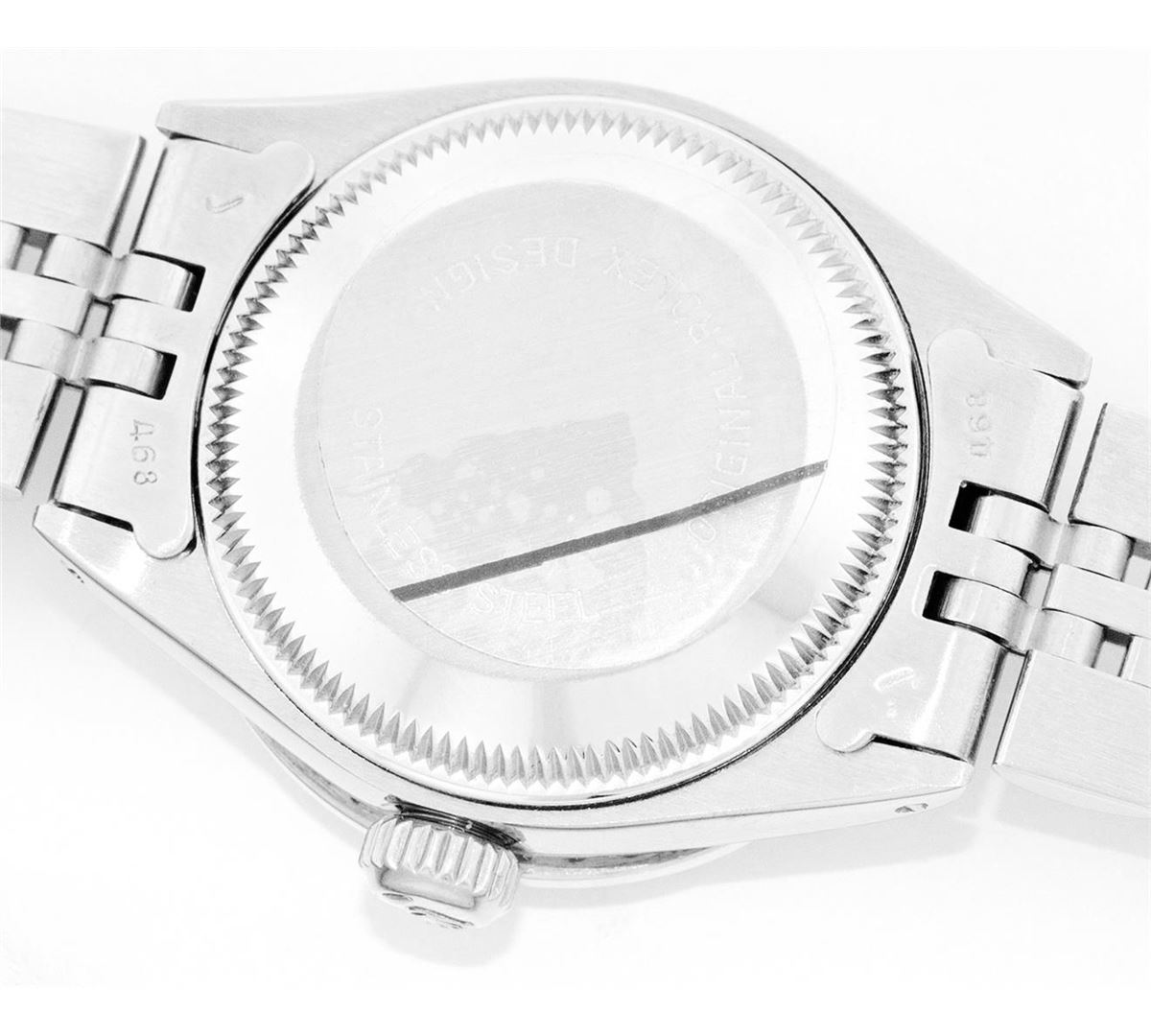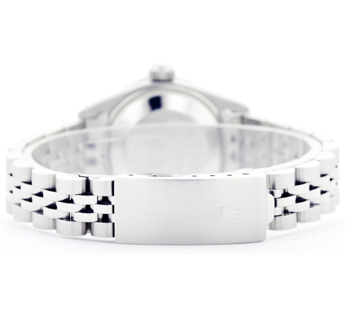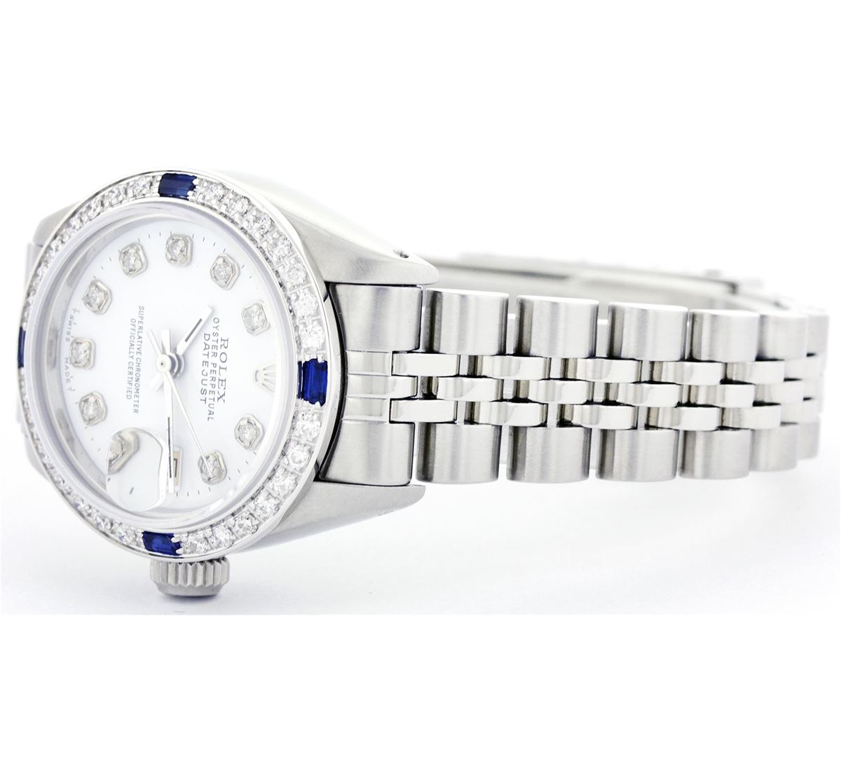 One Ladies Rolex Datejust Polished Bright with Satin Finish, Serviced & Electronically Tested, Stainless Steel Case:26mm, Stainless Steel Crown, Custom Bezel: 18K White Gold Sapphire Beadset Diamond Bezel, Diamond Count: 28 Diamonds + 4 Sapphires Total Weight .70 Carat, Clarity: SI-VS, Color: G to H. Custom Crystal: Synthetic Sapphire Cyclops Lens. Movement: Automatic Winding Movement Caliber 2030. Custom Dial: White Dial With Diamond Hour Markers, Diamond Count: 10 Diamonds, Clarity: SI-VS, Color: G to H. Date Window: 3 O'Clock Position Date Display, Non Quickset, Model: 6917 Condition: G-6 Extra Fine. Bracelet: Stainless Steel Jubilee. Bright Polish & Satin Finish. 5.5 Inch Length, Adjustable. Standard Clasp, With Rolex Logo.