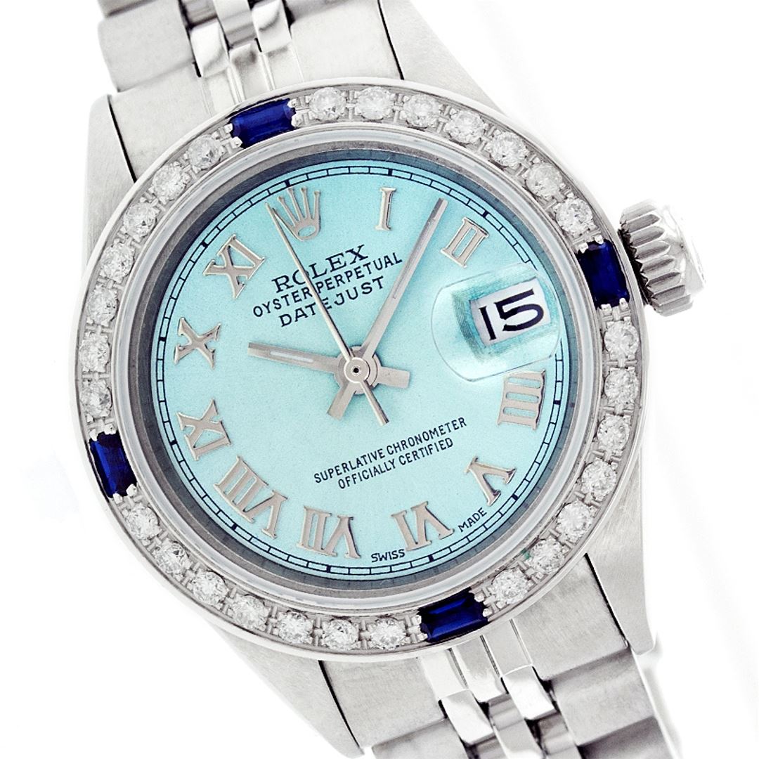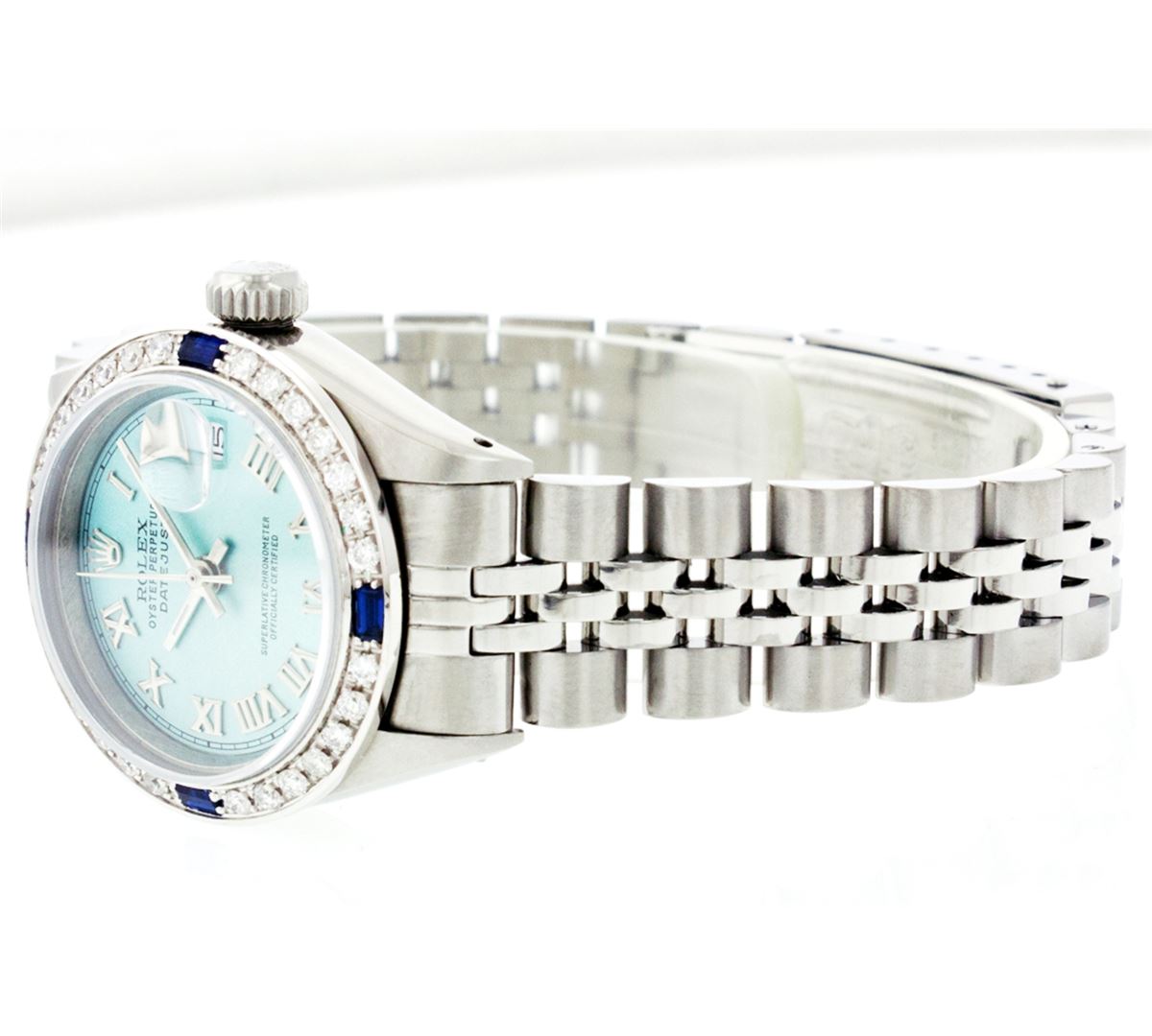 One Ladies Rolex Datejust Polished Bright with Satin Finish, Serviced & Electronically Tested, Stainless Steel Case:26mm, Stainless Steel Crown, Custom Bezel: 18K White Gold Sapphire Beadset Diamond Bezel, Diamond + Gem Count: 28 Diamonds + 4 Sapphires Total Weight .70 Carat, Clarity: Si-VS, Color: G to H. Custom Crystal: Synthetic Sapphire Cyclops Lens. Movement: Automatic Winding Movement Caliber 2030. Custom Dial: Ice Blue Roman Dial. Date Window: 3 O'Clock Position Date Display, Non Quickset, Model: 6917 Condition: G-6 Extra Fine. Bracelet: Stainless Steel Jubilee. Bright Polish & Satin Finish. 5.5 Inch Length, Adjustable. Standard Clasp, With Rolex Logo.