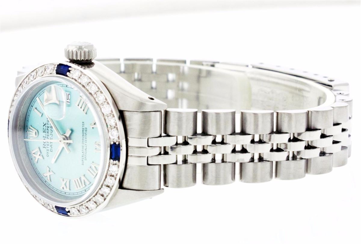 One Ladies Rolex Datejust Polished Bright with Satin Finish, Serviced & Electronically Tested, Stainless Steel Case:26mm, Stainless Steel Crown, Custom Bezel: 18K White Gold Sapphire Beadset Diamond Bezel, Diamond + Gem Count: 28 Diamonds + 4 Sapphires Total Weight .70 Carat, Clarity: Si-VS, Color: G to H. Custom Crystal: Synthetic Sapphire Cyclops Lens. Movement: Automatic Winding Movement Caliber 2030. Custom Dial: Ice Blue Roman Dial. Date Window: 3 O'Clock Position Date Display, Non Quickset, Model: 6917 Condition: G-6 Extra Fine. Bracelet: Stainless Steel Jubilee. Bright Polish & Satin Finish. 5.5 Inch Length, Adjustable. Standard Clasp, With Rolex Logo.
