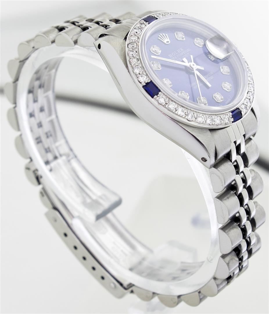 One Ladies Rolex Datejust Polished Bright with Satin Finish, Serviced & Electronically Tested, Stainless Steel Case:26mm, Stainless Steel Crown, Custom Bezel: 18K White Gold Sapphire Beadset Diamond Bezel, Diamond Count: 28 Diamonds + 4 Sapphires Total Weight .70 Carat, Clarity: SI-VS, Color: G to H. Custom Crystal: Synthetic Sapphire Cyclops Lens. Movement: Automatic Winding Movement Caliber 2030. Custom Dial: Blue Diamond Dial, Diamond Count: 10 Diamonds In Dial, Clarity: SI-VS, Color: G to H. Date Window: 3 O'Clock Position Date Display, Non Quickset, Model: 6917 Condition: G-6 Extra Fine. Bracelet: Stainless Steel Jubilee Band. Bright Polish & Satin Finish. 5.5 Inch Length, Adjustable. Standard Clasp, With Rolex Logo.