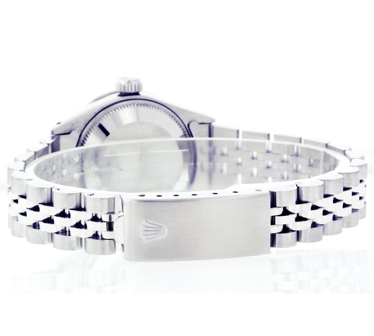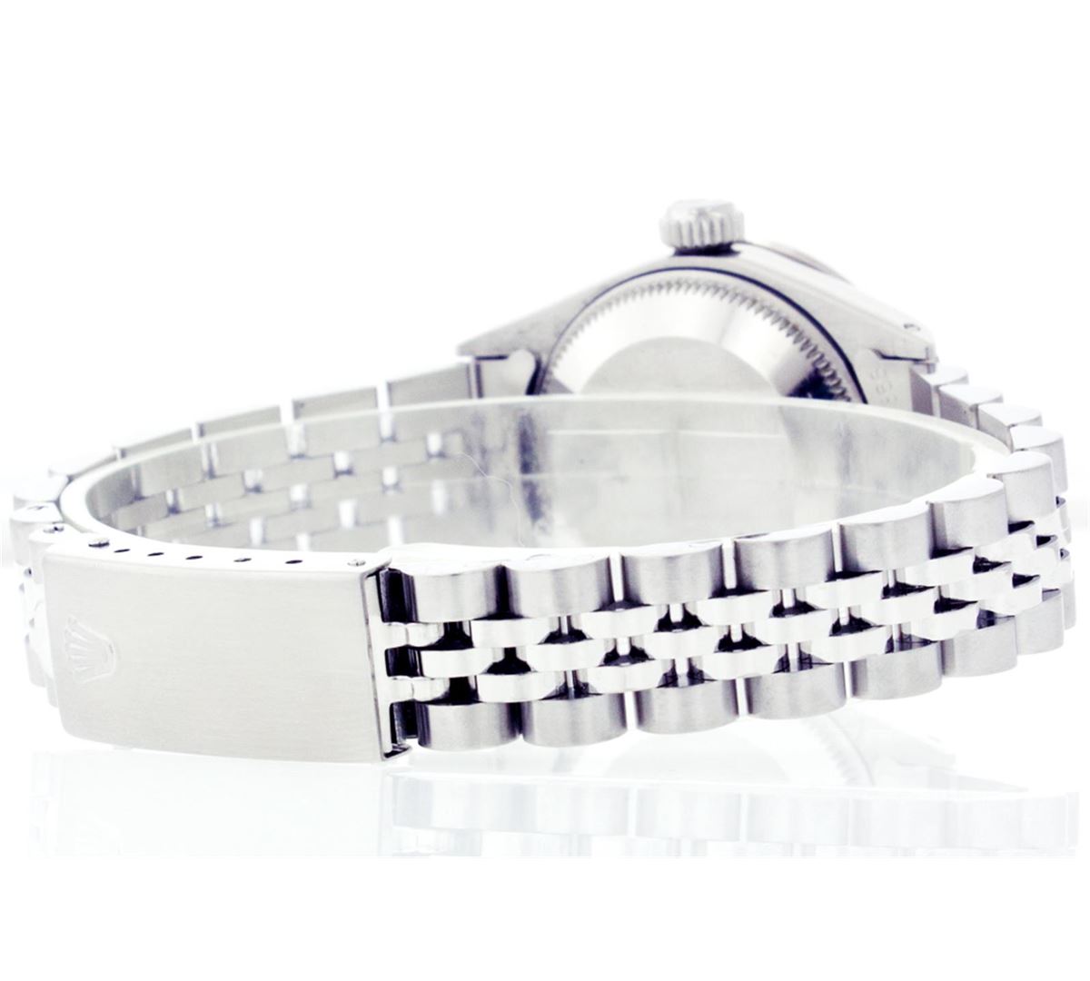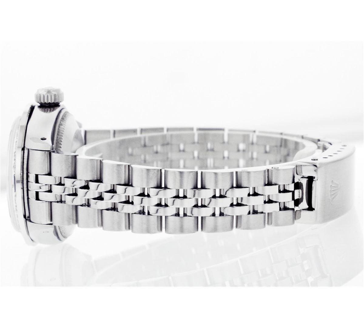 One Ladies Rolex Datejust Polished Bright with Satin Finish, Serviced & Electronically Tested, Stainless Steel Case:26mm, Stainless Steel Crown, Custom Bezel: 18K White Gold Sapphire Beadset Diamond Bezel, Diamond + Gem Count: 28 Diamonds + 4 Sapphires Total Weight .70 Carat, Clarity: Si-VS, Color: G to H. Custom Crystal: Synthetic Sapphire Cyclops Lens. Movement: Automatic Winding Movement Caliber 2030. Custom Dial: Ice Blue Roman Dial. Date Window: 3 O'Clock Position Date Display, Non Quickset, Model: 6917 Condition: G-6 Extra Fine. Bracelet: Stainless Steel Jubilee. Bright Polish & Satin Finish. 5.5 Inch Length, Adjustable. Standard Clasp, With Rolex Logo.