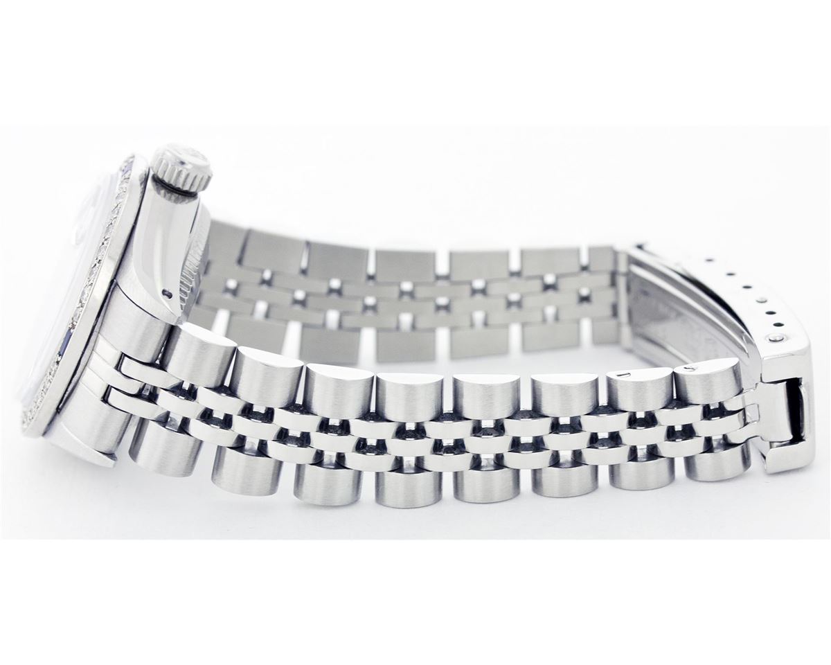 One Ladies Rolex Datejust Polished Bright with Satin Finish, Serviced & Electronically Tested, Stainless Steel Case:26mm, Stainless Steel Crown, Custom Bezel: 18K White Gold Sapphire Beadset Diamond Bezel, Diamond + Gem Count: 28 Diamonds + 4 Sapphires Total Weight .70 Carat, Clarity: SI-VS, Color: G to H. Custom Crystal: Synthetic Sapphire Cyclops Lens. Movement: Automatic Winding Movement Caliber 2030. Custom Dial: Refinished Blue Mother Of Pearl With Diamond Hour Markers, Diamond Count: 10, Clarity: SI-VS, Color: G to H. Date Window: 3 O'Clock Position Date Display, Quickset, Model: 6917 Condition: G-6 Extra Fine. Bracelet: Stainless Steel Jubilee. Bright Polish & Satin Finish. 5.5 Inch Length, Adjustable. Standard Clasp, With Rolex Logo.