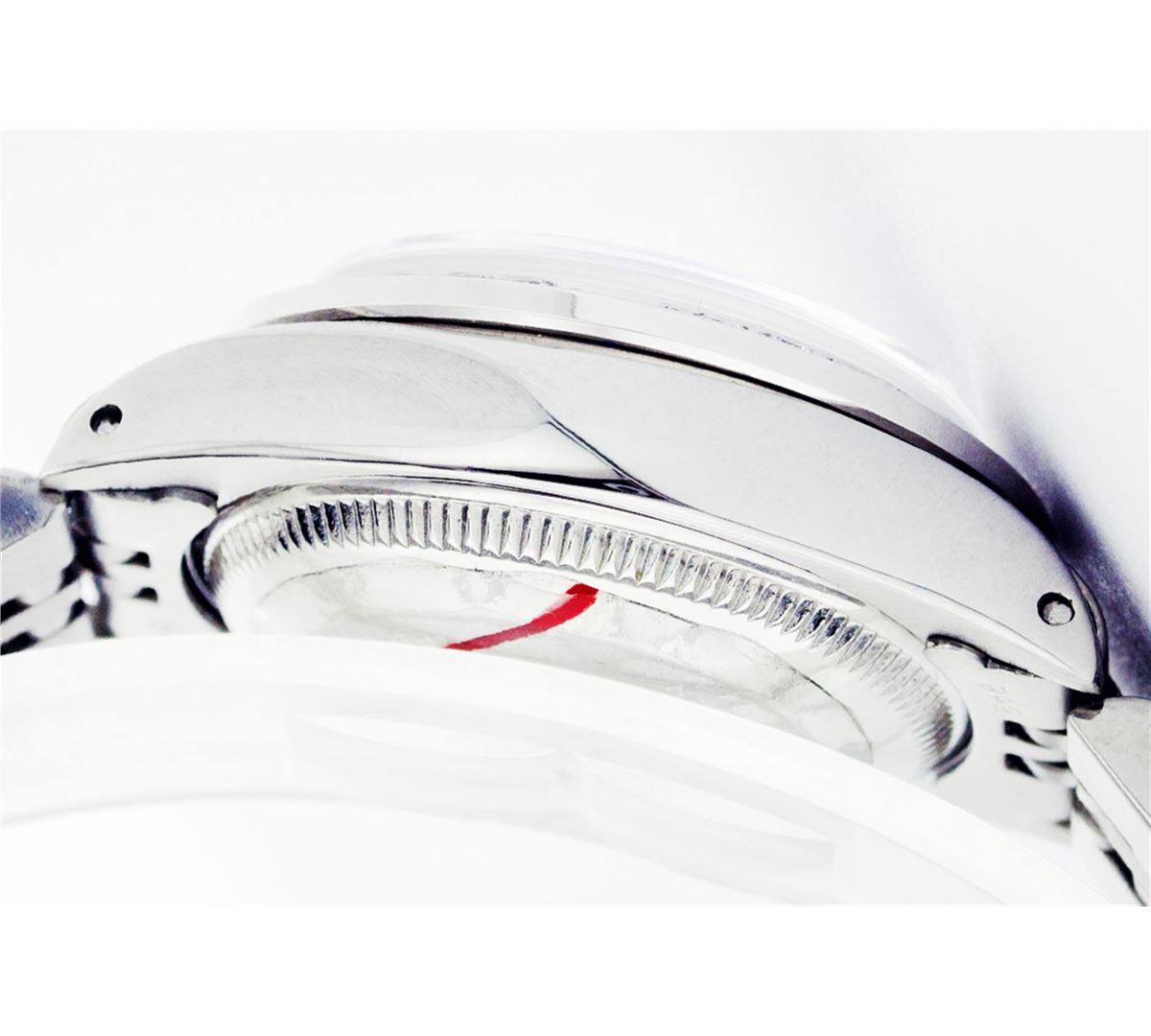 One Ladies Rolex Datejust Polished Bright with Satin Finish, Serviced & Electronically Tested, Stainless Steel Case:26mm, Stainless Steel Crown, Custom Bezel: 18K White Gold Sapphire Beadset Diamond Bezel, Diamond Count: 28 Diamonds + 4 Sapphires Total Weight .70 Carat, Clarity: SI-VS, Color: G to H. Custom Crystal: Synthetic Sapphire Cyclops Lens. Movement: Automatic Winding Movement Caliber 2030. Custom Dial: Black Dial with Diamond Hour Markers. Clarity: SI-VS, Color: G to H. Date Window: 3 O'Clock Position Date Display, Model: 6917 Condition: G-6 Extra Fine. Bracelet: Stainless Steel Jubilee Band. Non quickset. Bright Polish & Satin Finish. 5.5 Inch Length, Adjustable. Standard Clasp, With Rolex Logo.