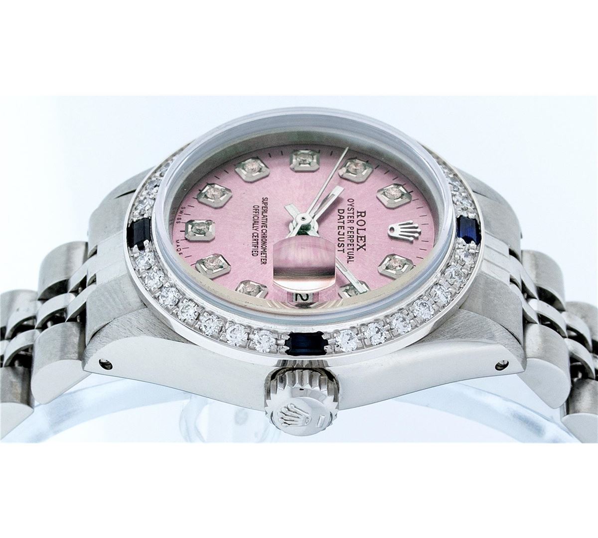 Ladies Rolex Datejust Polished Bright with Satin Finish, Serviced & Electronically Tested, Stainless Steel Case:26mm, Stainless Steel Crown, Custom Bezel: 18K White Gold Sapphire Beadset Diamond Bezel, Diamond + Gem Count: 28 Diamonds + 4 Sapphire. Total Weight .70 Carat, Clarity: SI-VS, Color: G to H. Custom Crystal: Synthetic Sapphire Cyclops Lens. Movement: Automatic Winding Movement Caliber 2030. Custom Dial: Refinished Pink With Diamond Hour Markers. Diamond Count: 10 Diamonds, Color: G To H, Clarity: SI-VS. Date Window: 3 O'Clock Position Date Display, Model: Datejust. Condition: G-6 Extra Fine. Bracelet: Stainless Steel Jubilee. Bright Polish & Satin Finish. 6.0 Inch Length, Adjustable. Standard Clasp, With Rolex Logo. Comes with 6 month warranty.