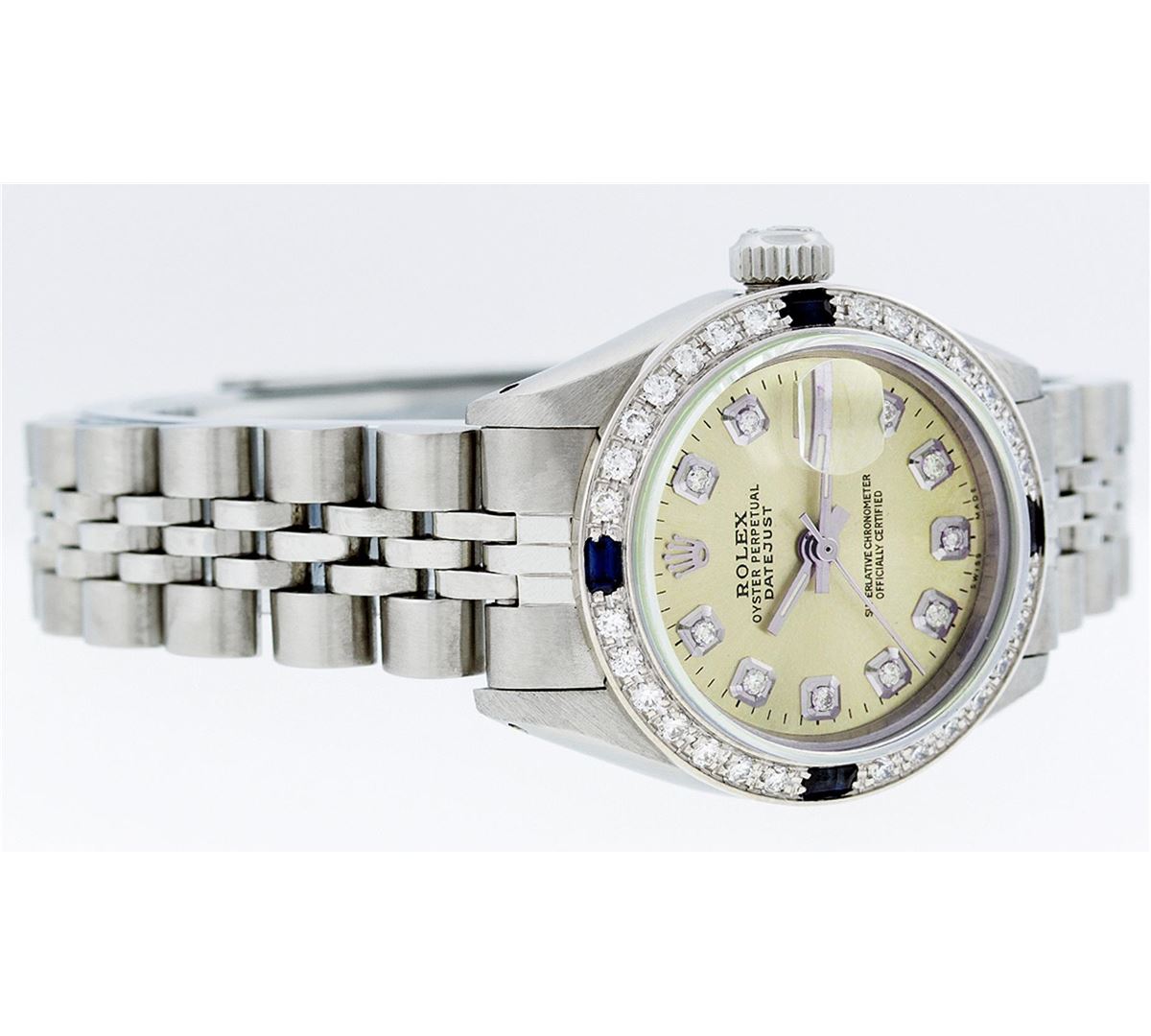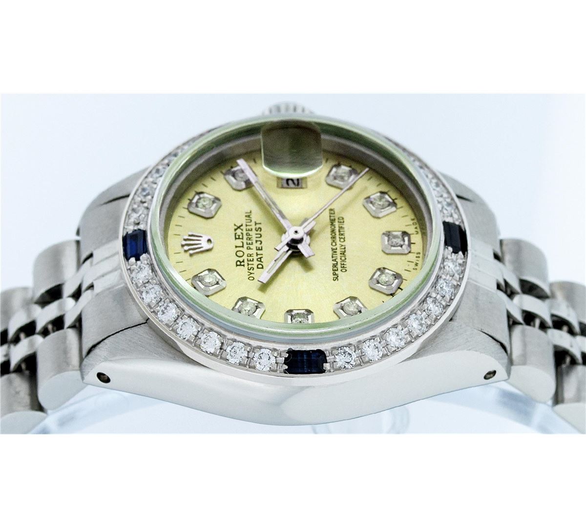 Ladies Rolex Datejust Polished Bright with Satin Finish, Serviced & Electronically Tested, Stainless Steel Case:26mm, Stainless Steel Crown, Custom Bezel: 18K White Gold Sapphire Beadset Diamond Bezel, Diamond + Gem Count: 28 Diamonds + 4 Sapphire. Total Weight .70 Carat, Clarity: SI-VS, Color: G to H. Custom Crystal: Synthetic Sapphire Cyclops Lens. Movement: Automatic Winding Movement Caliber 2030. Custom Dial: Refinished Yellow With Diamond Hour Markers. Diamond Count: 10 Diamonds, Color: G To H, Clarity: SI-VS. Date Window: 3 O'Clock Position Date Display, Model: Datejust. Condition: G-6 Extra Fine. Bracelet: Stainless Steel Jubilee. Bright Polish & Satin Finish. 6.0 Inch Length, Adjustable. Standard Clasp, With Rolex Logo. Comes with 6 month warranty.