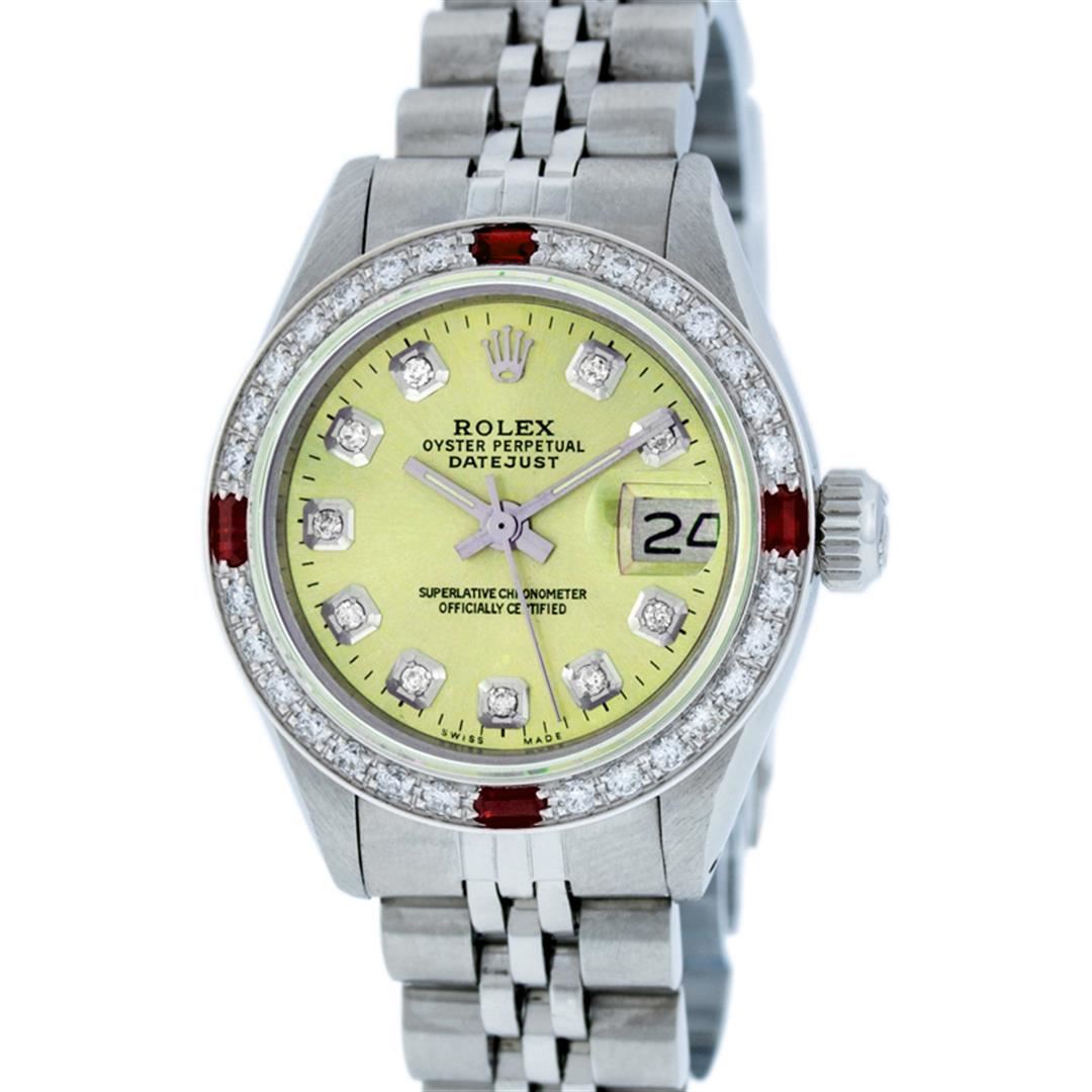 Ladies Rolex Datejust Polished Bright with Satin Finish, Serviced & Electronically Tested, Stainless Steel Case:26mm, Stainless Steel Crown, Custom Bezel: 18K White Gold Ruby Beadset Diamond Bezel, Diamond + Gem Count: 28 Diamonds + 4 Ruby. Total Weight .70 Carat, Clarity: SI-VS, Color: G to H. Custom Crystal: Synthetic Sapphire Cyclops Lens. Movement: Automatic Winding Movement Caliber 2030. Custom Dial: Refinished Yellow With Diamond Hour Markers. Diamond Count: 10 Diamonds, Color: G To H, Clarity: SI-VS. Date Window: 3 O'Clock Position Date Display, Model: Datejust. Condition: G-6 Extra Fine. Bracelet: Stainless Steel Jubilee. Bright Polish & Satin Finish. 6.0 Inch Length, Adjustable. Standard Clasp, With Rolex Logo. Comes with 6 month warranty.