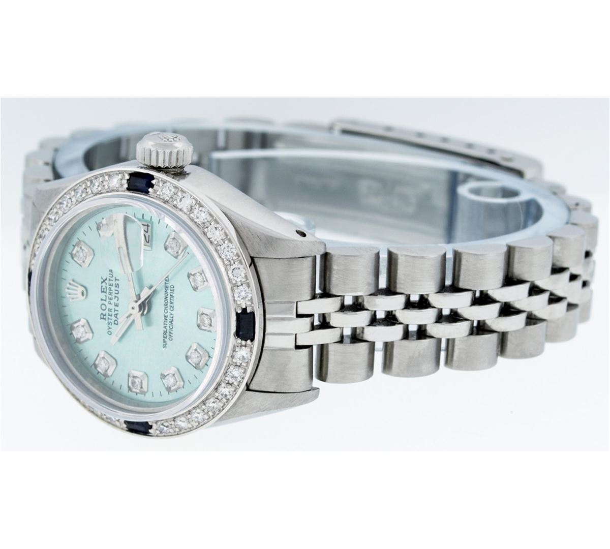 One Ladies Rolex Datejust Polished Bright with Satin Finish, Serviced & Electronically Tested, Stainless Steel Case:26mm, Stainless Steel Crown, Custom Bezel: 18K White Gold Sapphire Beadset Diamond Bezel, Diamond Count: 28 Diamonds + 4 Sapphires Total Weight .70 Carat, Clarity: SI-VS, Color: G to H. Custom Crystal: Synthetic Sapphire Cyclops Lens. Movement: Automatic Winding Movement Caliber 2030. Custom Dial: Ice Blue Diamond Dial With Line Track, Diamond Count: 10 Diamonds In Dial, Clarity: SI-VS, Color: G to H. Date Window: 3 O'Clock Position Date Display, Model: Datejust. Condition: G-6 Extra Fine. Bracelet: Stainless Steel Jubilee Band. Bright Polish & Satin Finish. 6.0 Inch Length, Adjustable. Standard Clasp, With Rolex Logo. Comes with 6 month warranty.