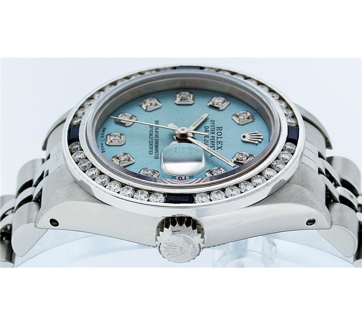 One Ladies Rolex Datejust Polished Bright with Satin Finish, Serviced & Electronically Tested, Stainless Steel Case:26mm, Stainless Steel Crown, Custom Bezel: 18K White Gold Sapphire Channel Set Diamond Bezel, Diamond + Gem Count: 36 Diamonds + 4 Sapphires Total Weight 1.00 Carat, Clarity: SI-VS, Color: G to H. Custom Crystal: Synthetic Sapphire Cyclops Lens. Movement: Automatic Winding Movement Caliber 2030. Custom Dial: Ice Blue Diamond Dial, Diamond Count: 10 Diamonds, Clarity: SI-VS, Color: G to H. Date Window: 3 O'Clock Position. Date Display, Model: Datejust, Condition: G-6 Extra Fine. Bracelet: Stainless Steel Jubilee. Bright Polish & Satin Finish. 6.0 Inch Length, Adjustable. Standard Clasp, With Rolex Logo. Comes with 6 month warranty.