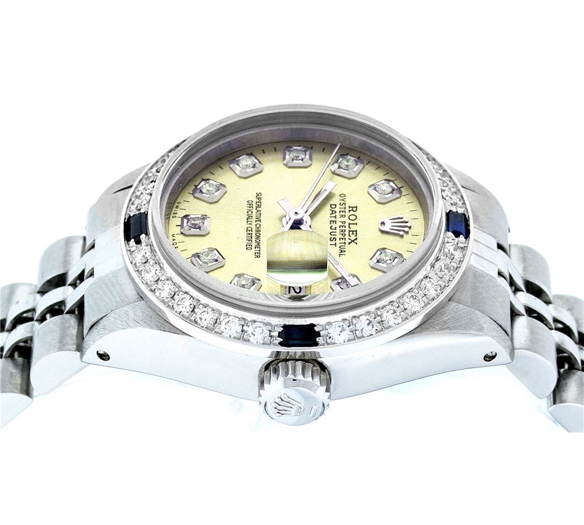 Ladies Rolex Datejust Polished Bright with Satin Finish, Serviced & Electronically Tested, Stainless Steel Case:26mm, Stainless Steel Crown, Custom Bezel: 18K White Gold Sapphire Beadset Diamond Bezel, Diamond + Gem Count: 28 Diamonds + 4 Sapphire. Total Weight .70 Carat, Clarity: SI-VS, Color: G to H. Custom Crystal: Synthetic Sapphire Cyclops Lens. Movement: Automatic Winding Movement Caliber 2030. Custom Dial: Refinished Yellow With Diamond Hour Markers. Diamond Count: 10 Diamonds, Color: G To H, Clarity: SI-VS. Date Window: 3 O'Clock Position Date Display, Model: Datejust. Condition: G-6 Extra Fine. Bracelet: Stainless Steel Jubilee. Bright Polish & Satin Finish. 6.0 Inch Length, Adjustable. Standard Clasp, With Rolex Logo. Comes with 6 month warranty.