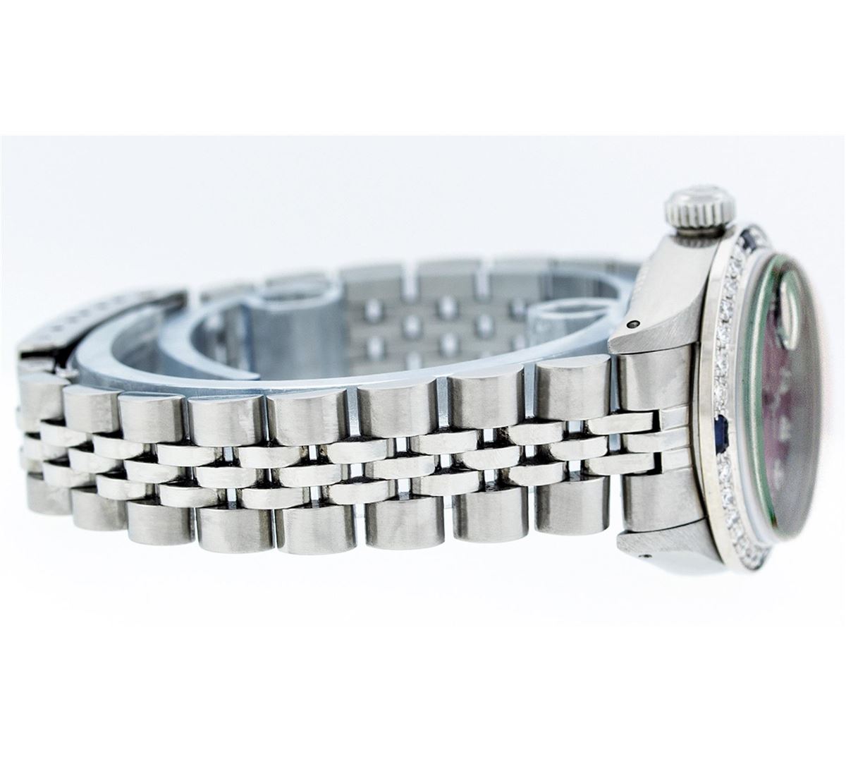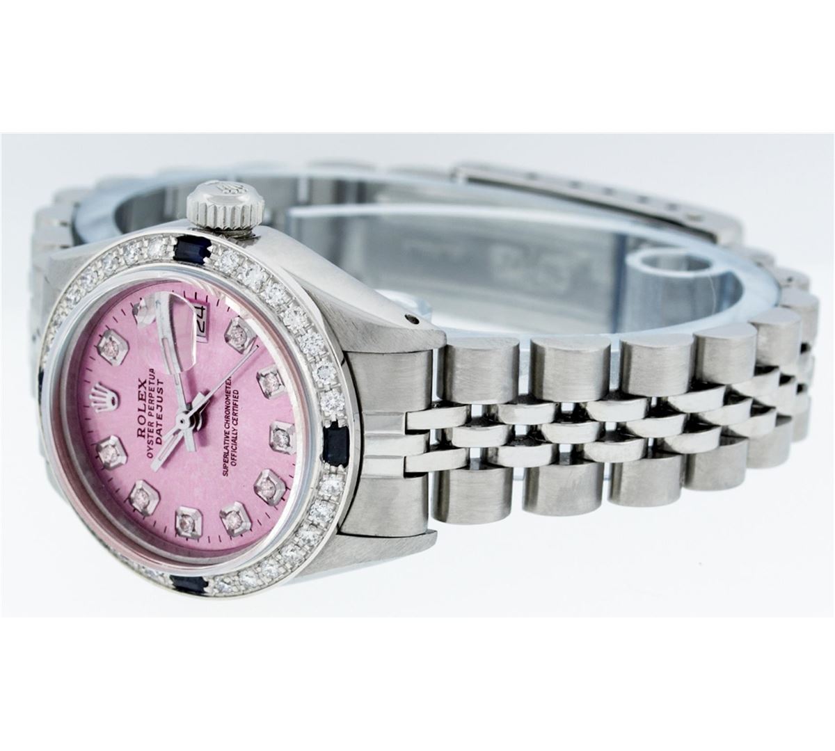 Ladies Rolex Datejust Polished Bright with Satin Finish, Serviced & Electronically Tested, Stainless Steel Case:26mm, Stainless Steel Crown, Custom Bezel: 18K White Gold Sapphire Beadset Diamond Bezel, Diamond + Gem Count: 28 Diamonds + 4 Sapphire. Total Weight .70 Carat, Clarity: SI-VS, Color: G to H. Custom Crystal: Synthetic Sapphire Cyclops Lens. Movement: Automatic Winding Movement Caliber 2030. Custom Dial: Refinished Pink With Diamond Hour Markers. Diamond Count: 10 Diamonds, Color: G To H, Clarity: SI-VS. Date Window: 3 O'Clock Position Date Display, Model: Datejust. Condition: G-6 Extra Fine. Bracelet: Stainless Steel Jubilee. Bright Polish & Satin Finish. 6.0 Inch Length, Adjustable. Standard Clasp, With Rolex Logo. Comes with 6 month warranty.