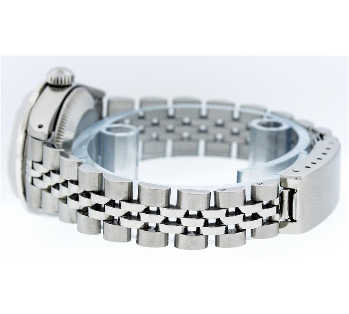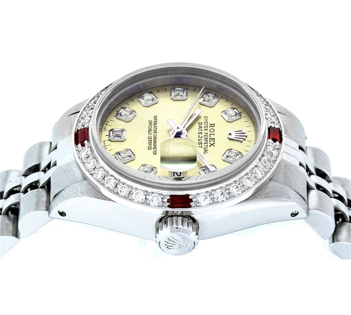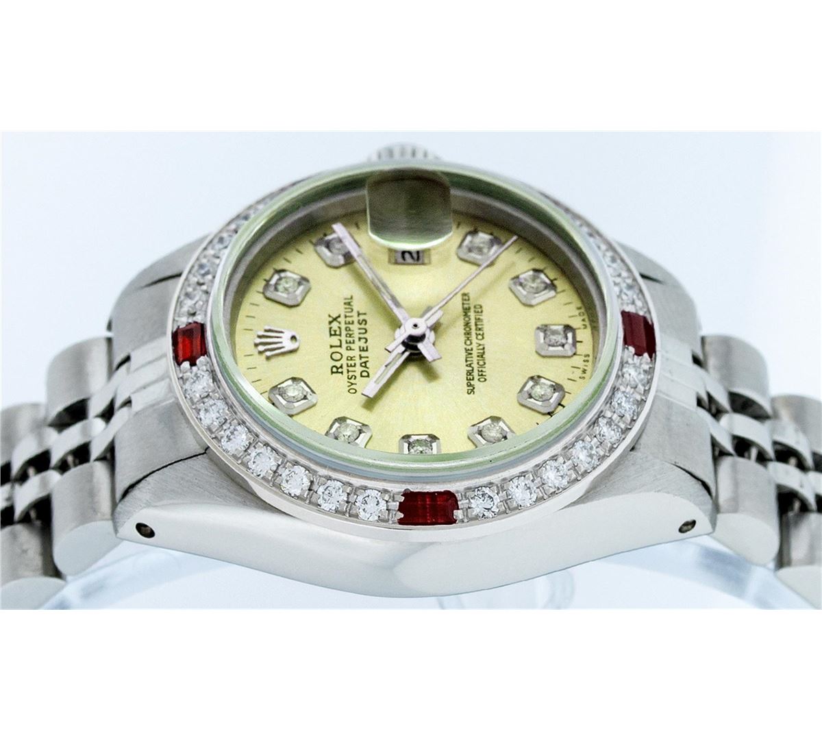 Ladies Rolex Datejust Polished Bright with Satin Finish, Serviced & Electronically Tested, Stainless Steel Case:26mm, Stainless Steel Crown, Custom Bezel: 18K White Gold Ruby Beadset Diamond Bezel, Diamond + Gem Count: 28 Diamonds + 4 Ruby. Total Weight .70 Carat, Clarity: SI-VS, Color: G to H. Custom Crystal: Synthetic Sapphire Cyclops Lens. Movement: Automatic Winding Movement Caliber 2030. Custom Dial: Refinished Yellow With Diamond Hour Markers. Diamond Count: 10 Diamonds, Color: G To H, Clarity: SI-VS. Date Window: 3 O'Clock Position Date Display, Model: Datejust. Condition: G-6 Extra Fine. Bracelet: Stainless Steel Jubilee. Bright Polish & Satin Finish. 6.0 Inch Length, Adjustable. Standard Clasp, With Rolex Logo. Comes with 6 month warranty.