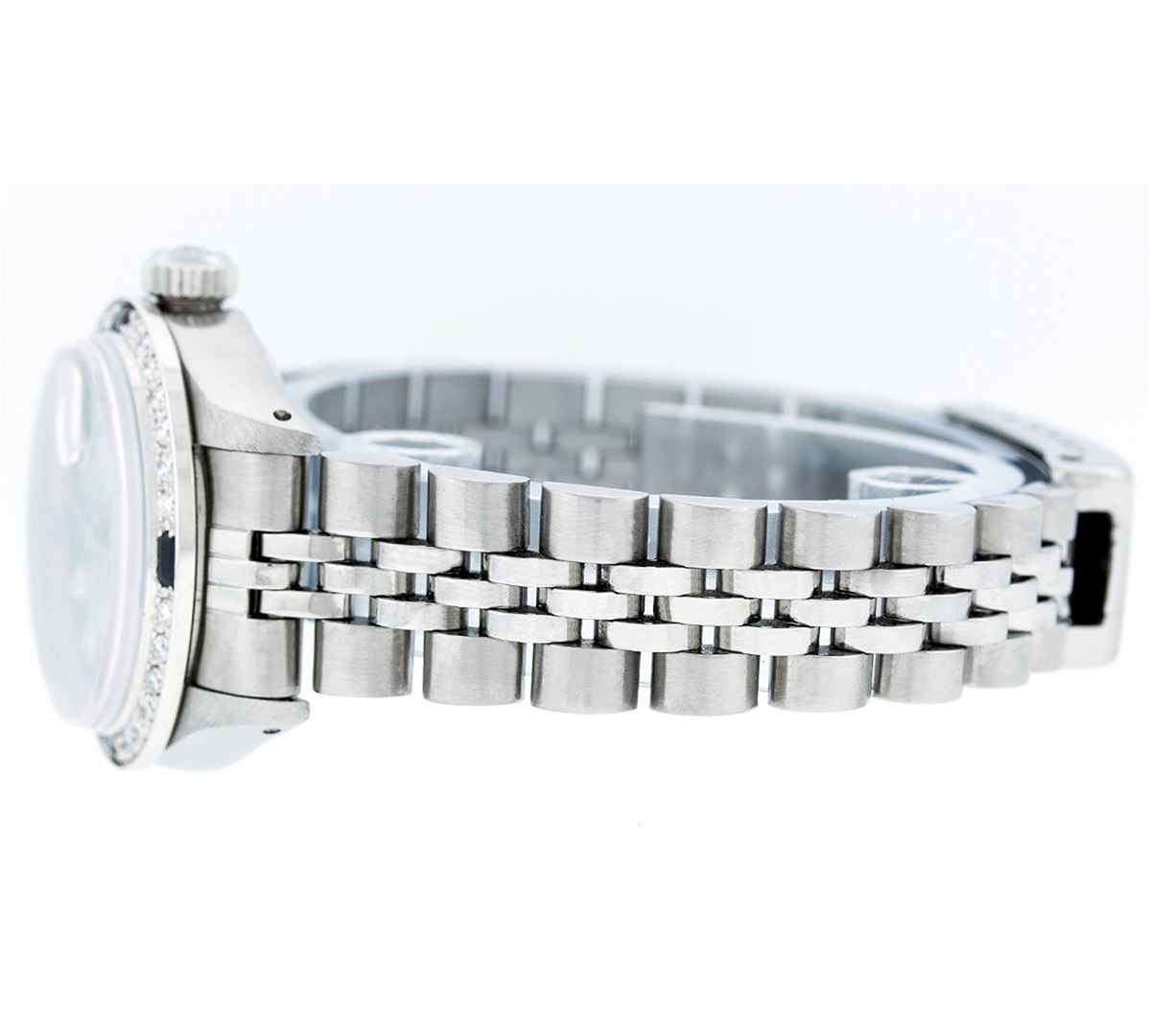 Ladies Rolex Datejust Polished Bright with Satin Finish, Serviced & Electronically Tested, Stainless Steel Case:26mm, Stainless Steel Crown, Custom Bezel: 18K White Gold Sapphire Beadset Diamond Bezel, Diamond + Gem Count: 28 Diamonds + 4 Sapphire. Total Weight .70 Carat, Clarity: SI-VS, Color: G to H. Custom Crystal: Synthetic Sapphire Cyclops Lens. Movement: Automatic Winding Movement Caliber 2030. Custom Dial: Refinished Yellow With Diamond Hour Markers. Diamond Count: 10 Diamonds, Color: G To H, Clarity: SI-VS. Date Window: 3 O'Clock Position Date Display, Model: Datejust. Condition: G-6 Extra Fine. Bracelet: Stainless Steel Jubilee. Bright Polish & Satin Finish. 6.0 Inch Length, Adjustable. Standard Clasp, With Rolex Logo. Comes with 6 month warranty.