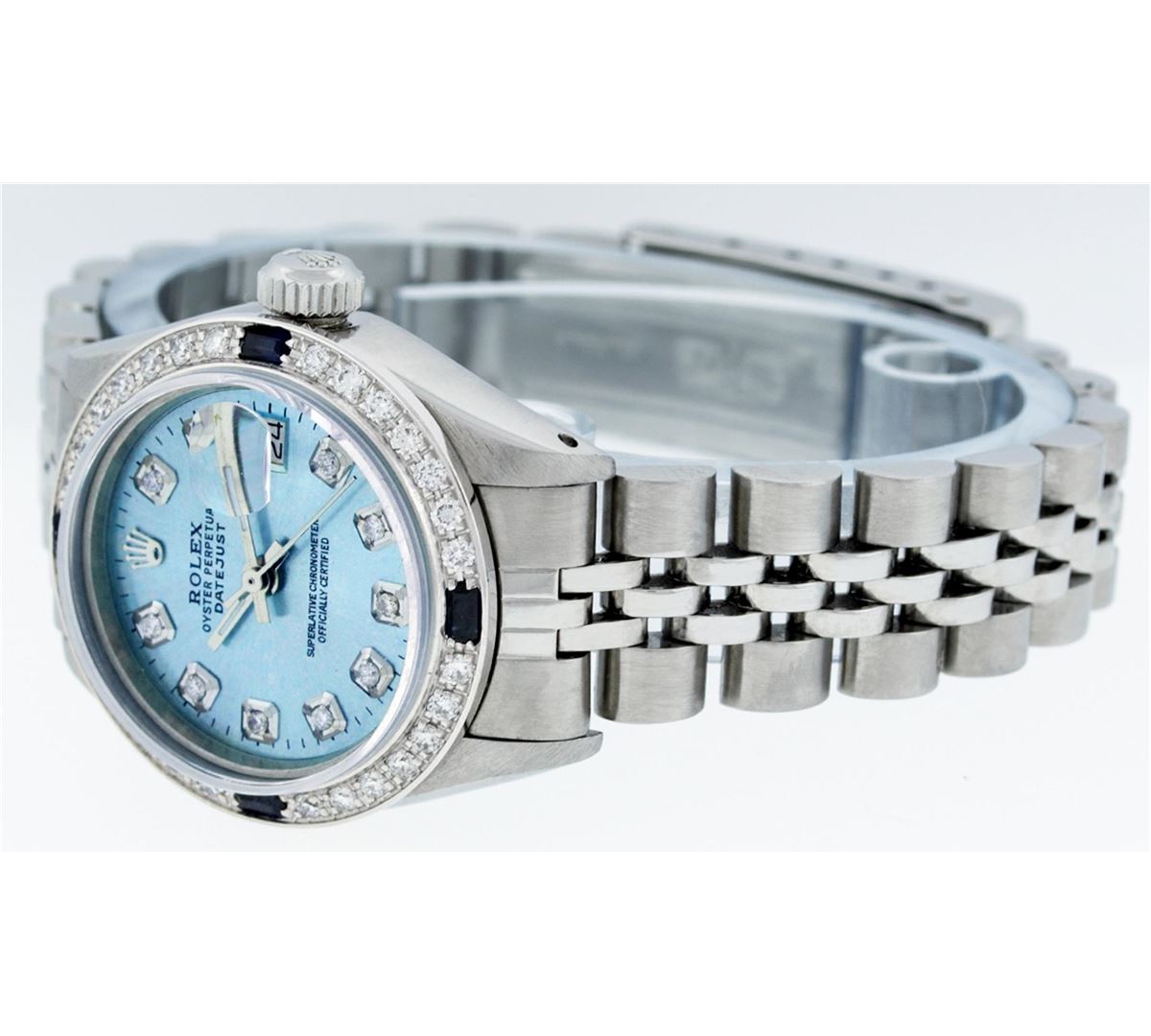 Ladies Rolex Datejust Polished Bright with Satin Finish, Serviced & Electronically Tested, Stainless Steel Case:26mm, Stainless Steel Crown, Custom Bezel: 18K White Gold Sapphire Beadset Diamond Bezel, Diamond + Gem Count: 28 Diamonds + 4 Sapphire. Total Weight .70 Carat, Clarity: SI-VS, Color: G to H. Custom Crystal: Synthetic Sapphire Cyclops Lens. Movement: Automatic Winding Movement Caliber 2030. Custom Dial: Refinished Sky Blue With Diamond Hour Markers. Diamond Count: 10 Diamonds, Color: G To H, Clarity: SI-VS. Date Window: 3 O'Clock Position Date Display, Model: Datejust. Condition: G-6 Extra Fine. Bracelet: Stainless Steel Jubilee. Bright Polish & Satin Finish. 6.0 Inch Length, Adjustable. Standard Clasp, With Rolex Logo. Comes with 6 month warranty.