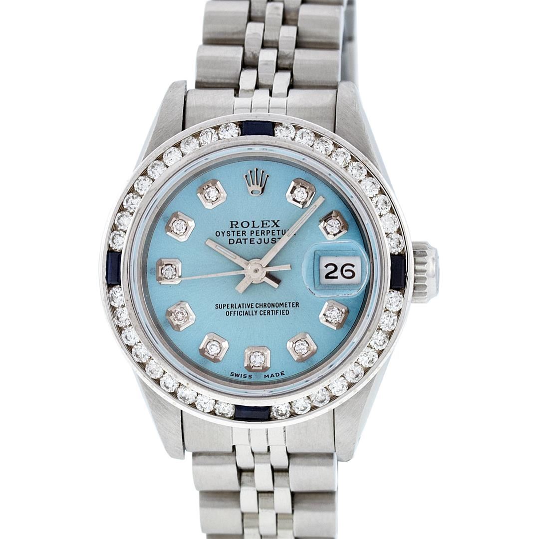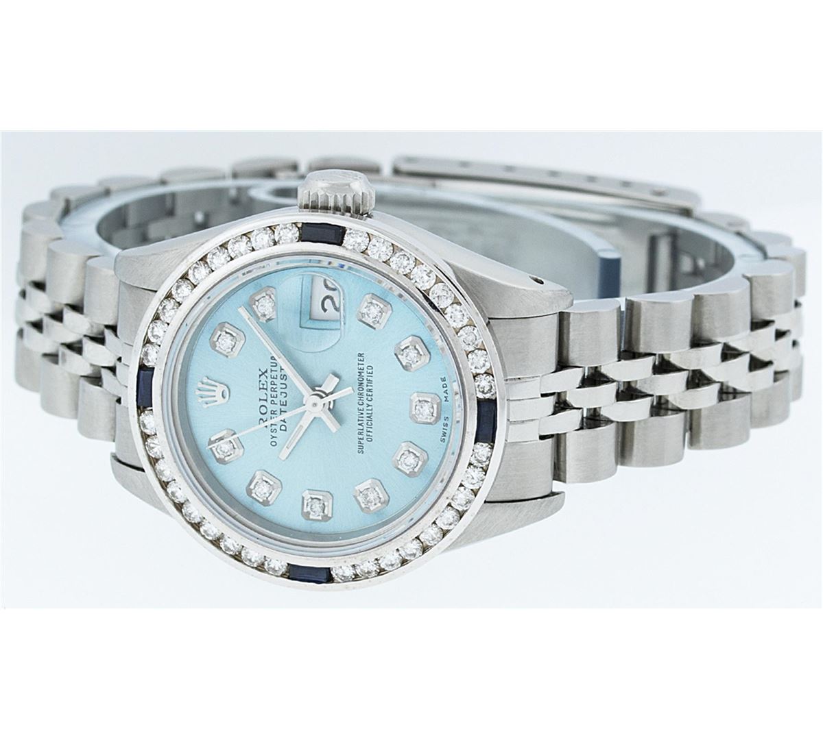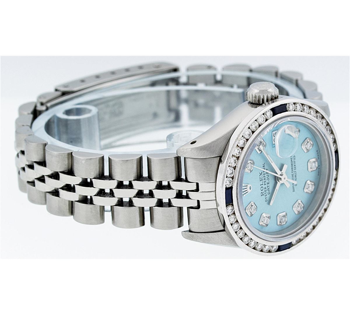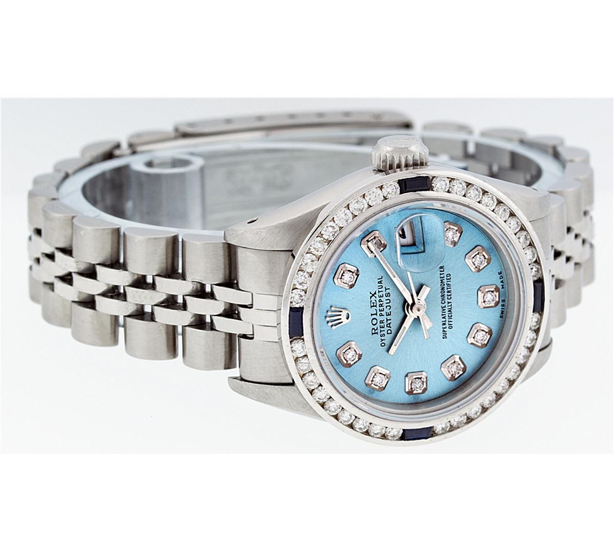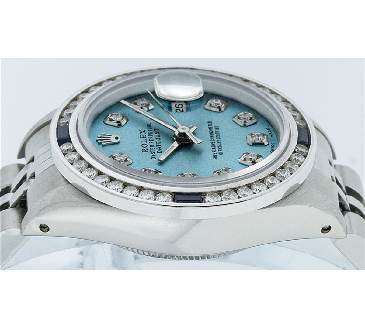 One Ladies Rolex Datejust Polished Bright with Satin Finish, Serviced & Electronically Tested, Stainless Steel Case:26mm, Stainless Steel Crown, Custom Bezel: 18K White Gold Sapphire Channel Set Diamond Bezel, Diamond + Gem Count: 36 Diamonds + 4 Sapphires Total Weight 1.00 Carat, Clarity: SI-VS, Color: G to H. Custom Crystal: Synthetic Sapphire Cyclops Lens. Movement: Automatic Winding Movement Caliber 2030. Custom Dial: Ice Blue Diamond Dial, Diamond Count: 10 Diamonds, Clarity: SI-VS, Color: G to H. Date Window: 3 O'Clock Position. Date Display, Model: Datejust, Condition: G-6 Extra Fine. Bracelet: Stainless Steel Jubilee. Bright Polish & Satin Finish. 6.0 Inch Length, Adjustable. Standard Clasp, With Rolex Logo. Comes with 6 month warranty.