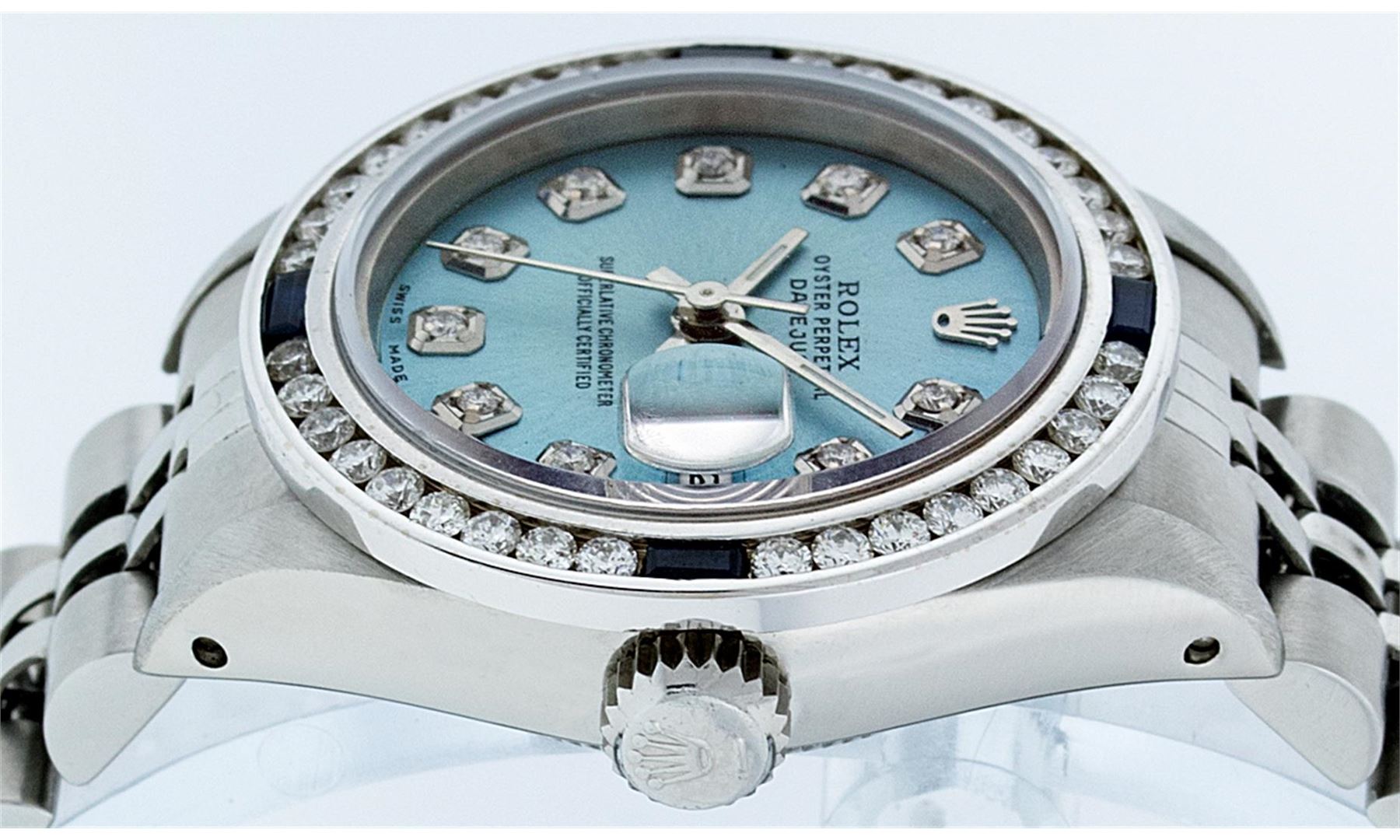 One Ladies Rolex Datejust Polished Bright with Satin Finish, Serviced & Electronically Tested, Stainless Steel Case:26mm, Stainless Steel Crown, Custom Bezel: 18K White Gold Sapphire Channel Set Diamond Bezel, Diamond + Gem Count: 36 Diamonds + 4 Sapphires Total Weight 1.00 Carat, Clarity: SI-VS, Color: G to H. Custom Crystal: Synthetic Sapphire Cyclops Lens. Movement: Automatic Winding Movement Caliber 2030. Custom Dial: Ice Blue Diamond Dial, Diamond Count: 10 Diamonds, Clarity: SI-VS, Color: G to H. Date Window: 3 O'Clock Position. Date Display, Model: Datejust, Condition: G-6 Extra Fine. Bracelet: Stainless Steel Jubilee. Bright Polish & Satin Finish. 6.0 Inch Length, Adjustable. Standard Clasp, With Rolex Logo. Comes with 6 month warranty.