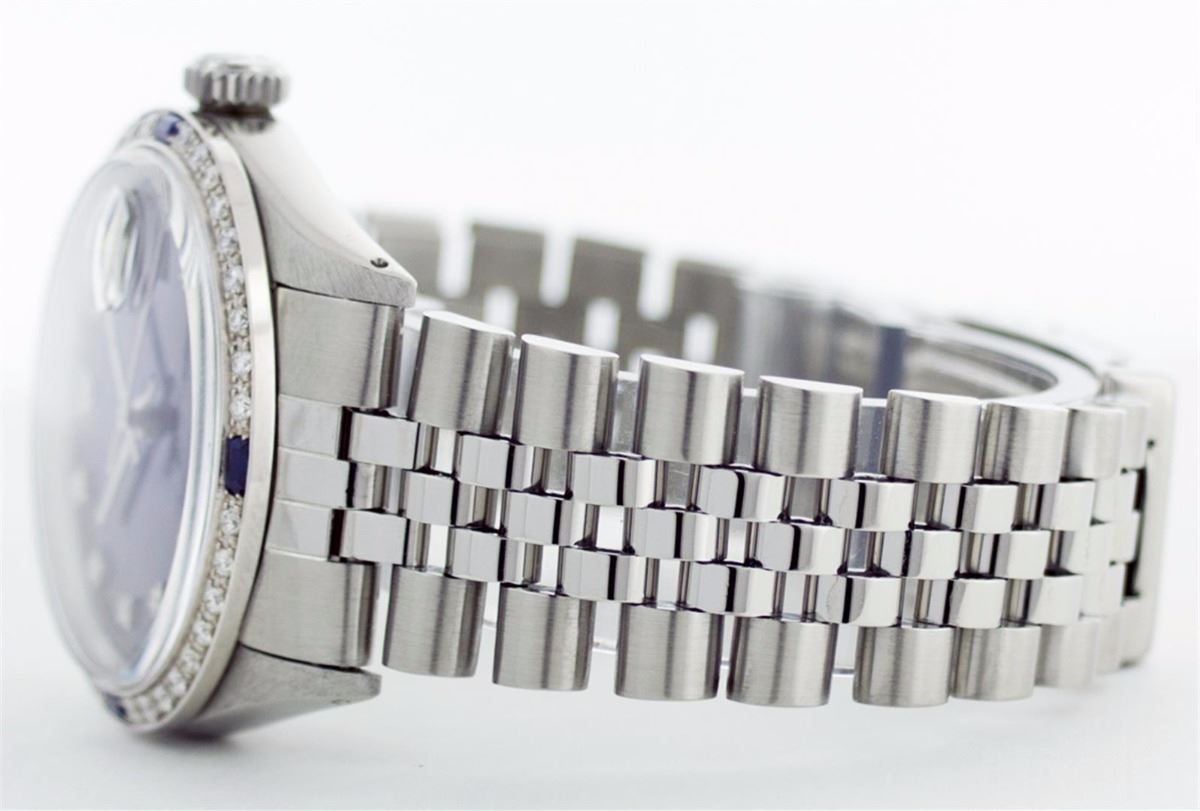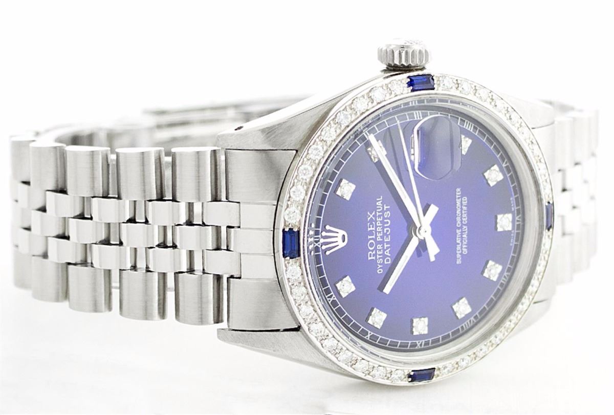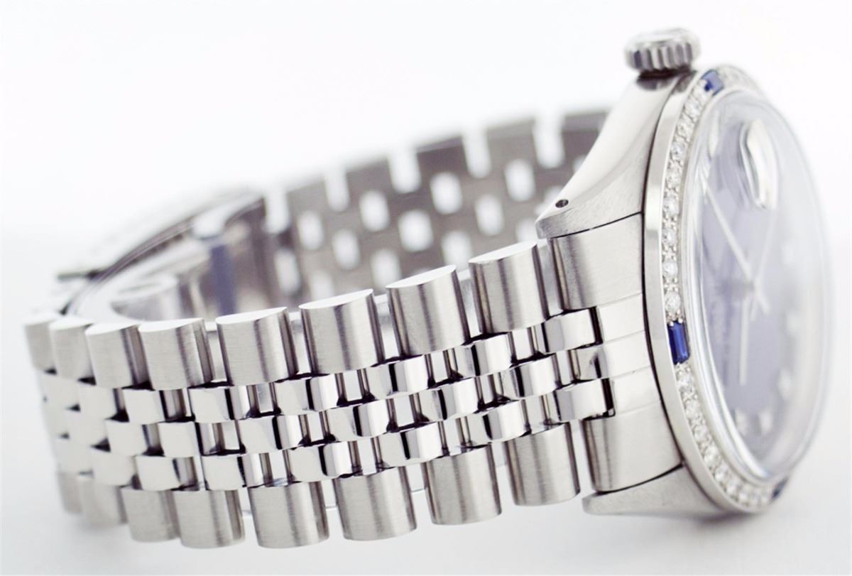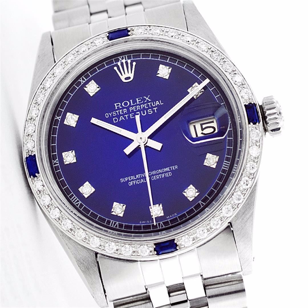 One Gents Rolex Datejust Polished Bright with Satin Finish, Serviced & Electronically Tested, Stainless Steel Case:36mm, Stainless Steel Crown, Custom Bezel: 18K White Gold Sapphire Beadset Diamond Bezel, Diamond Count: 36 Diamonds + 4 Sapphires Total Weight 1.00 Carat, Clarity: SI-VS, Color: G to H. Custom Crystal: Synthetic Sapphire Cyclops Lens. Movement: Automatic Winding Movement Caliber 3035. Original Dial: Blue With Diamond Hour Markers, 10 Diamond in Dial G To H In Color, Clarity: SI-VS. Date Window: 3 O'Clock Position Date Display, Quickset, Model: 16014 Condition: G-6 Extra Fine. Bracelet: Stainless Steel Jubilee. Bright Polish & Satin Finish. 6.5 Inch Length, Adjustable. Standard Clasp, With Rolex Logo.