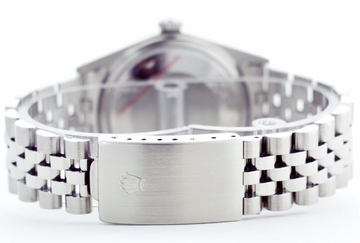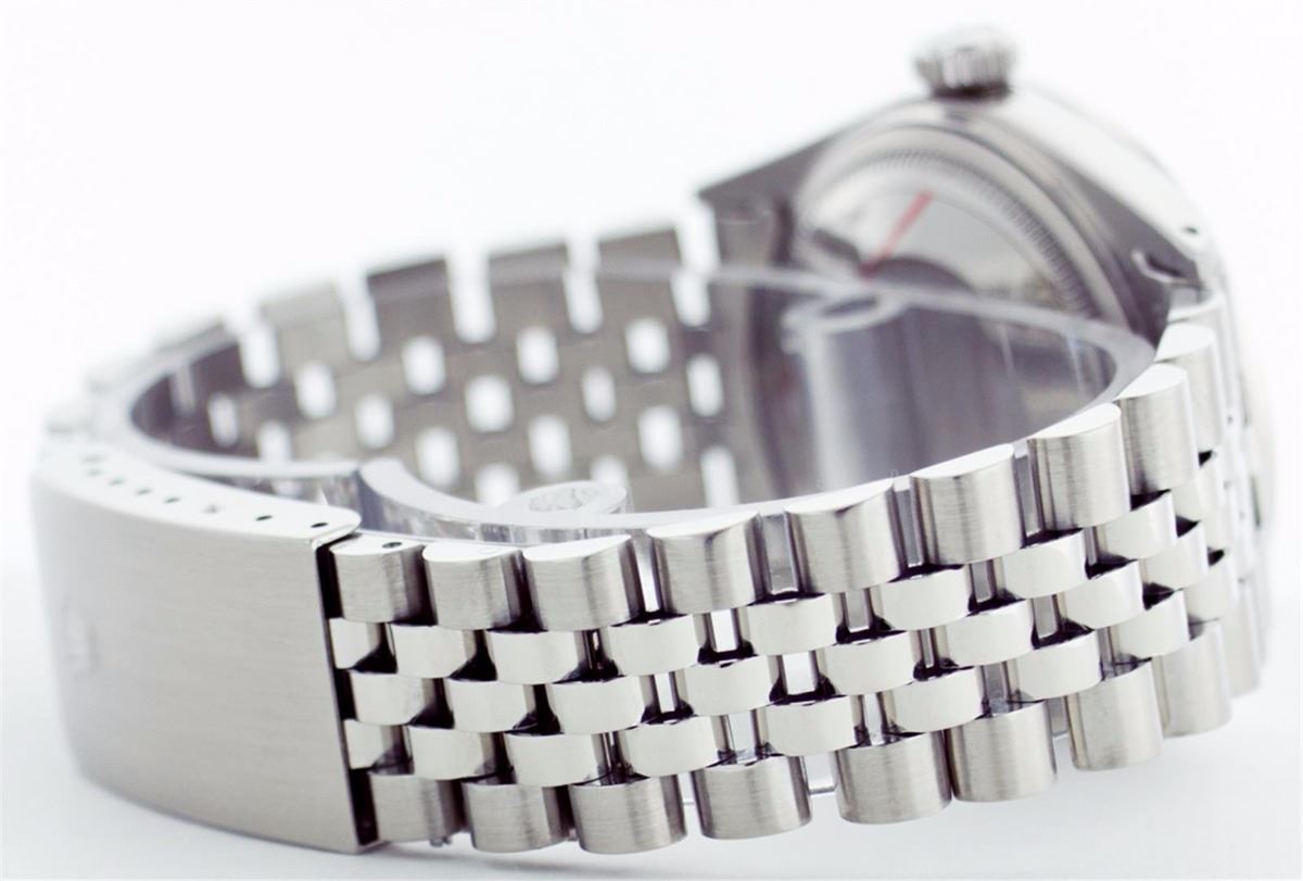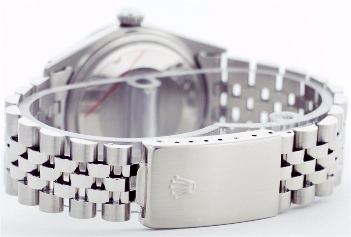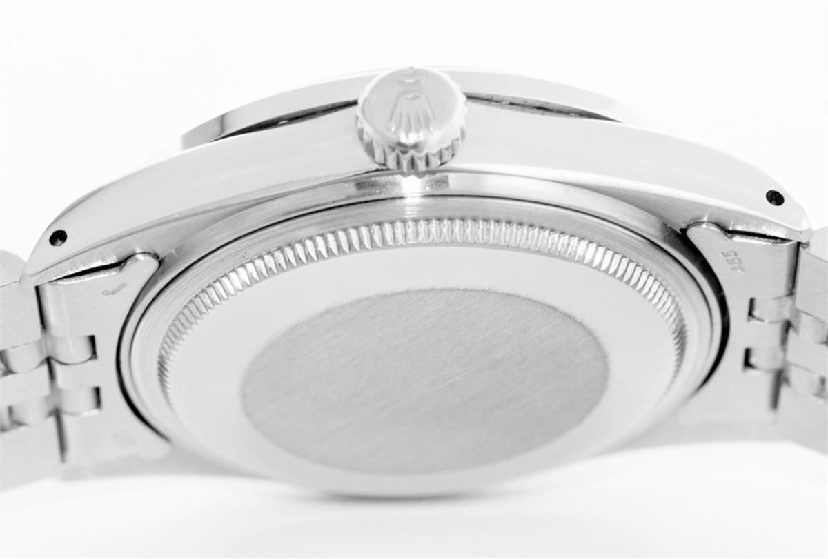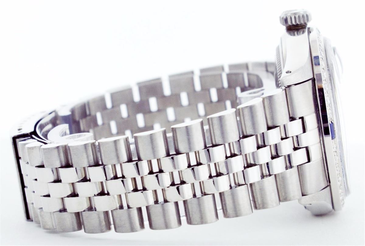 One Gents Rolex Datejust Polished Bright with Satin Finish, Serviced & Electronically Tested, Stainless Steel Case:36mm, Stainless Steel Crown, Custom Bezel: 18K White Gold Sapphire Beadset Diamond Bezel, Diamond Count: 36 Diamonds + 4 Sapphires Total Weight 1.00 Carat, Clarity: SI-VS, Color: G to H. Custom Crystal: Synthetic Sapphire Cyclops Lens. Movement: Automatic Winding Movement Caliber 3035. Original Dial: Blue With Diamond Hour Markers, 10 Diamond in Dial G To H In Color, Clarity: SI-VS. Date Window: 3 O'Clock Position Date Display, Quickset, Model: 16014 Condition: G-6 Extra Fine. Bracelet: Stainless Steel Jubilee. Bright Polish & Satin Finish. 6.5 Inch Length, Adjustable. Standard Clasp, With Rolex Logo.