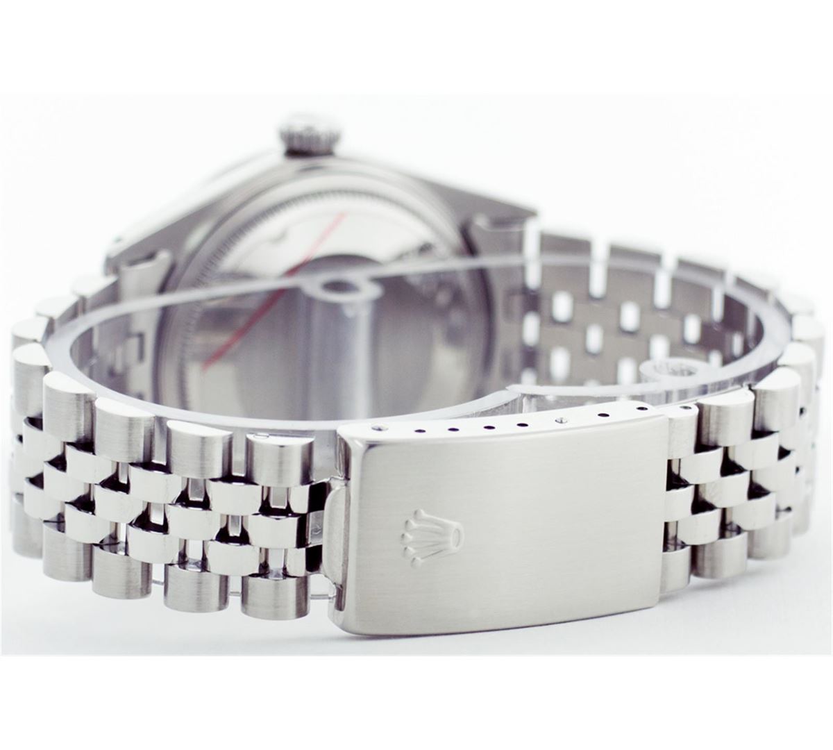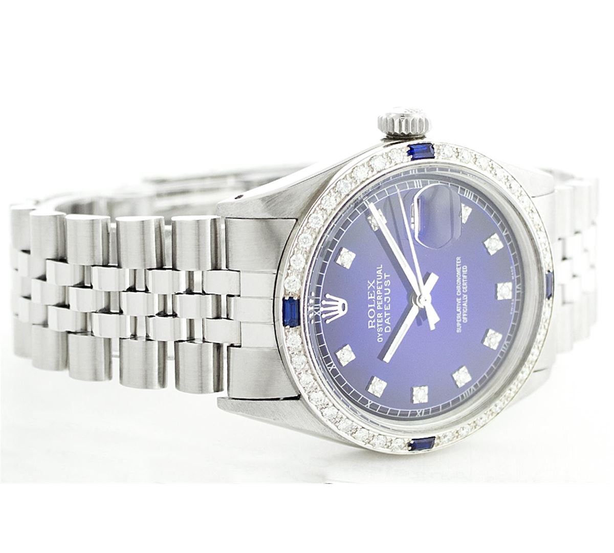 One Mens Rolex Datejust Polished Bright with Satin Finish, Serviced & Electronically Tested, Stainless Steel Case:36mm, Stainless Steel Crown, Custom Bezel: 18K White Gold Sapphire Beadset Diamond Bezel, Diamond Count: 36 Diamonds + 4 Sapphires Total Weight 1.00 Carat, Clarity: SI-VS, Color: G to H. Custom Crystal: Synthetic Sapphire Cyclops Lens. Movement: Automatic Winding Movement Caliber 3035. Original Dial: Blue Vignette With Diamond Hour Markers, 10 Diamond in Dial G To H In Color, Clarity: SI-VS. Date Window: 3 O'Clock Position Date Display, Quickset, Model: 16014 Condition: G-6 Extra Fine. Bracelet: Stainless Steel Jubilee. Bright Polish & Satin Finish. 6.5 Inch Length, Adjustable. Standard Clasp, With Rolex Logo.