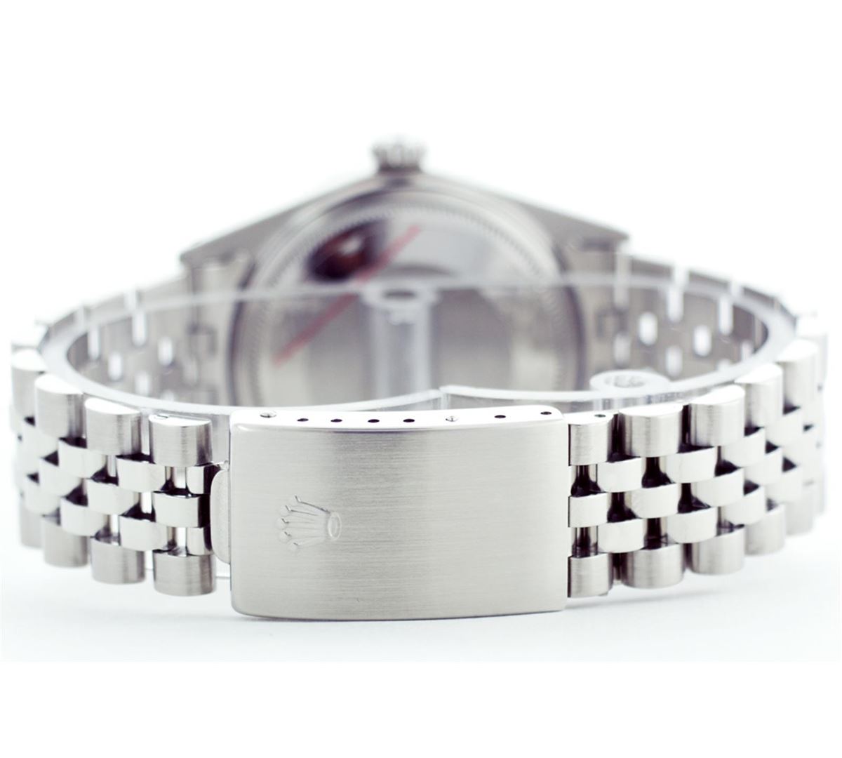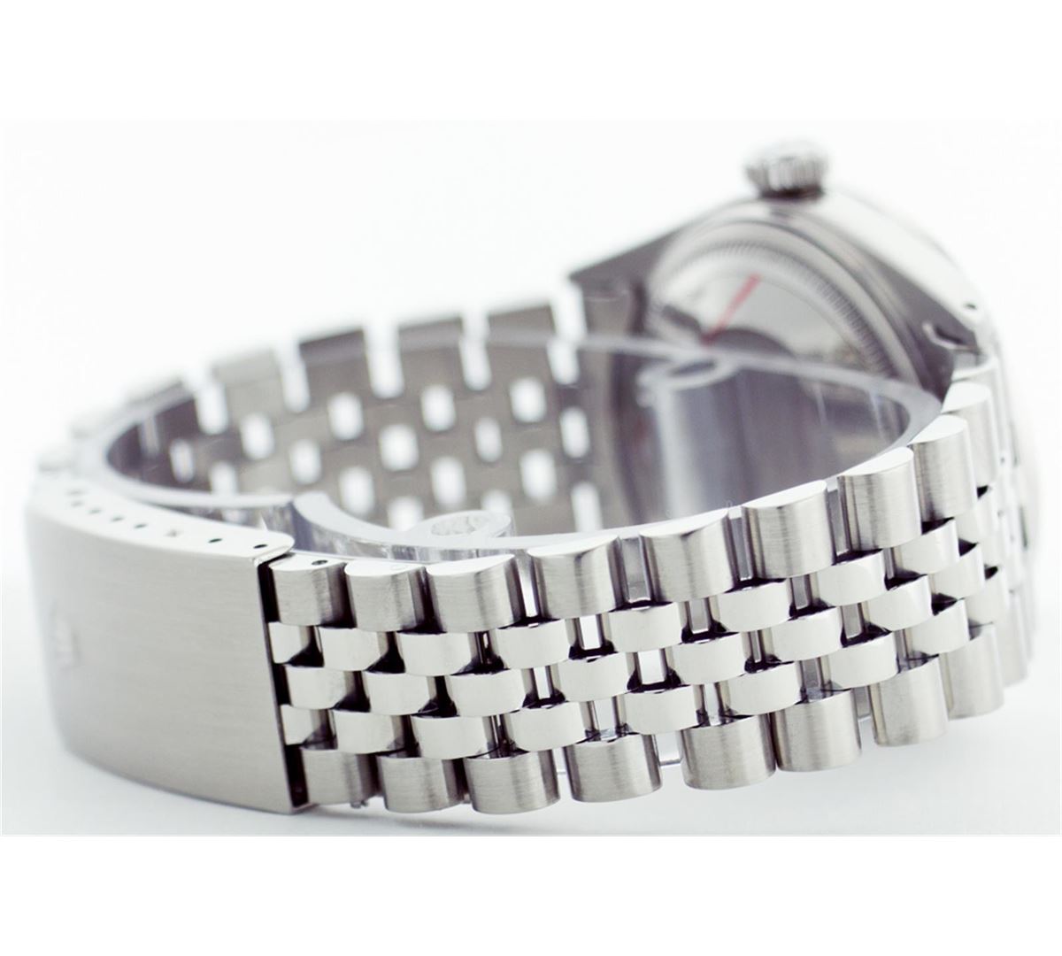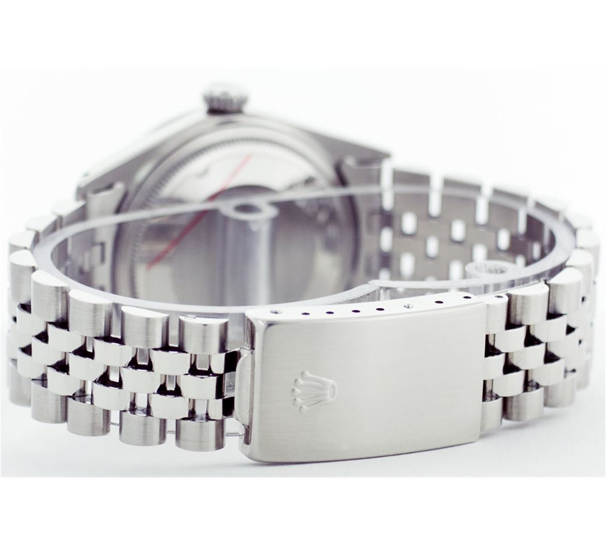 One Gents Rolex Datejust Polished Bright with Satin Finish, Serviced & Electronically Tested, Stainless Steel Case:36mm, Stainless Steel Crown, Custom Bezel: 18K White Gold Sapphire Beadset Diamond Bezel, Diamond Count: 36 Diamonds + 4 Sapphires Total Weight 1.00 Carat, Clarity: SI-VS, Color: G to H. Custom Crystal: Synthetic Sapphire Cyclops Lens. Movement: Automatic Winding Movement Caliber 3035. Original Dial: Blue With Diamond Hour Markers, 10 Diamond in Dial G To H In Color, Clarity: SI-VS. Date Window: 3 O'Clock Position Date Display, Quickset, Model: 16014 Condition: G-6 Extra Fine. Bracelet: Stainless Steel Jubilee. Bright Polish & Satin Finish. 6.5 Inch Length, Adjustable. Standard Clasp, With Rolex Logo.