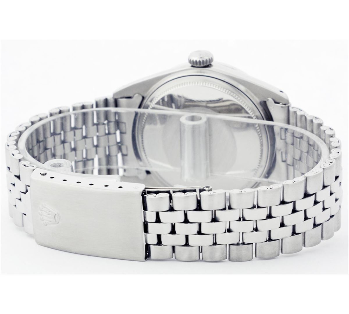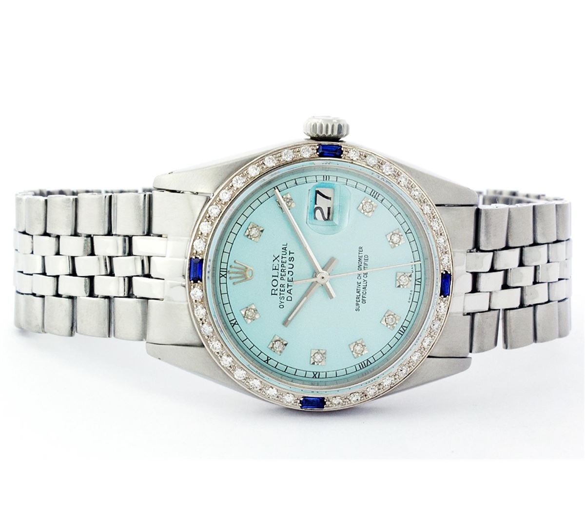 One Gents Rolex Datejust Polished, Serviced & Electronically Tested, Stainless Steel Case:36mm, Stainless Steel Crown, Custom Bezel: 18K White Gold Sapphire Beadset Diamond Bezel, Diamond + Gem Count: 36 Diamonds + 4 Sapphires Total Weight 1.00 Carat, Clarity: SI-VS, Color: G to H. Custom Crystal: Synthetic Sapphire Cyclops Lens. Movement: Automatic Winding Movement Caliber 3035. Custom Dial: Ice Blue With Diamond Hour Markers, 10 Diamond Dial G To H In Color, Clarity: SI-VS. Date Window: 3 O'Clock Position Date Display, Quickset, Model: 16014 Condition: G-6 Extra Fine. Bracelet: Stainless Steel Jubilee. Bright Polish & Satin Finish. 6.5 Inch Length, Adjustable. Standard Clasp, With Rolex Logo.