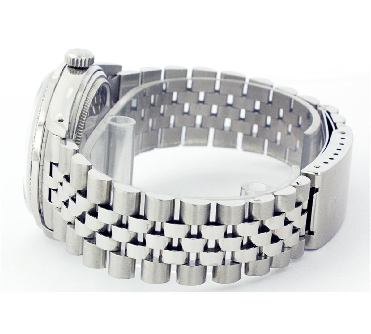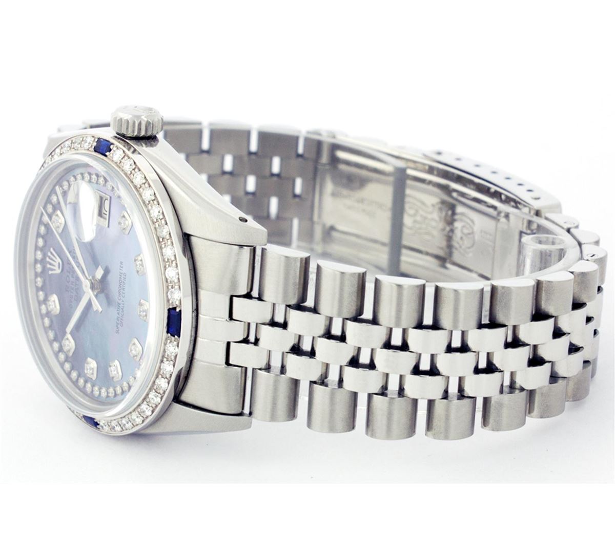 One Mens Rolex Datejust Polished, Serviced & Electronically Tested, Stainless Steel Case:36mm, Stainless Steel Crown, Custom Bezel: 18K White Gold Sapphire Beadset Diamond Bezel, Diamond + Gem Count: 36 Diamonds + 4 Sapphires Total Weight 1.00 Carat, Clarity: SI-VS, Color: G to H. Custom Crystal: Synthetic Sapphire Cyclops Lens. Movement: Automatic Winding Movement Caliber 3035. Custom Dial: Tahitian Mother Of Pearl With String Diamond Dial, Diamond Count: 43 Diamonds In Dial, Clarity: SI-VS, Color: G to H. Date Window: 3 O'Clock Position Date Display, Quickset, Model: 16014 Condition: G-6 Extra Fine. Bracelet: Stainless Steel Jubilee. Bright Polish & Satin Finish. 6.5 Inch Length, Adjustable. Standard Clasp, With Rolex Logo.