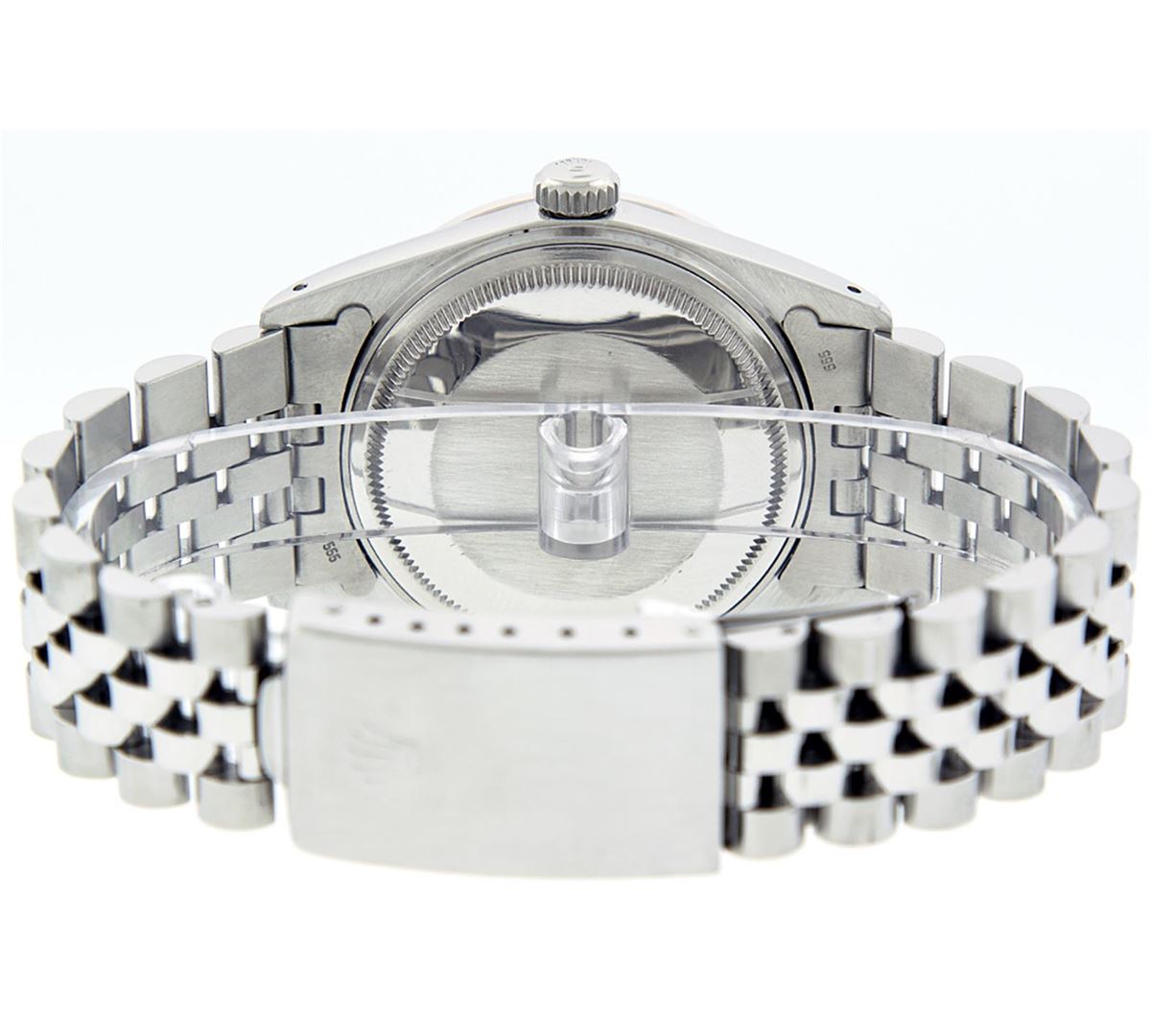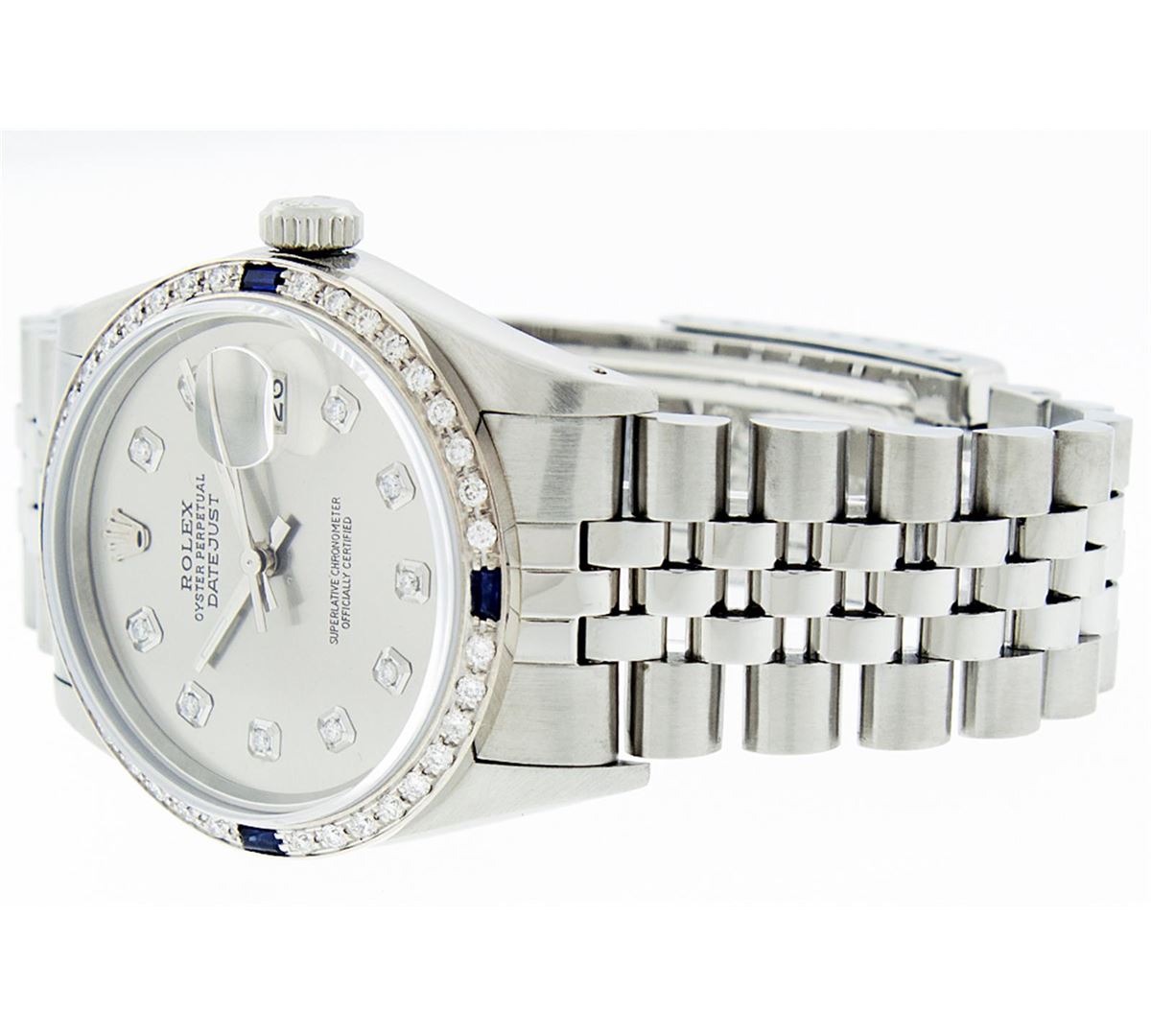 One Mens Rolex Datejust Polished Bright with Satin Finish, Serviced & Electronically Tested, Stainless Steel Case: 36mm, Stainless Steel Crown, Custom Bezel: 18K White Gold Sapphire Beadset Diamond Bezel, Diamond + Gem Count: 36 Diamonds + 4 Sapphires Total Weight 1.00 Carat, Clarity: SI-VS, Color: G to H. Custom Crystal: Synthetic Sapphire Cyclops Lens. Movement: Automatic Winding Movement Caliber 3135. Custom Dial: Slate Grey With Diamond Hour Markers, 10 Diamond Dial G To H In Color, Clarity: SI-VS. Date Window: 3 O'Clock Position Date Display, Quickset, Model: 16234 Condition: G-6 Extra Fine. Bracelet: Stainless Steel Jubilee. Bright Polish & Satin Finish. 6.5 Inch Length, Adjustable. Standard Clasp, With Rolex Logo.
