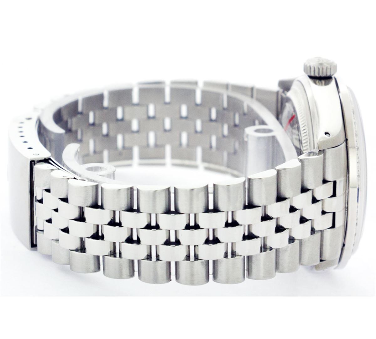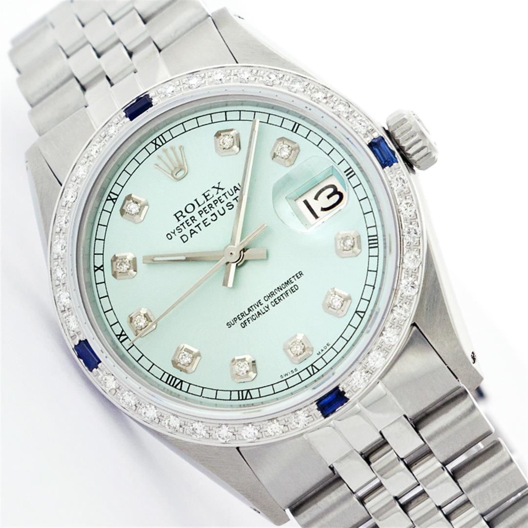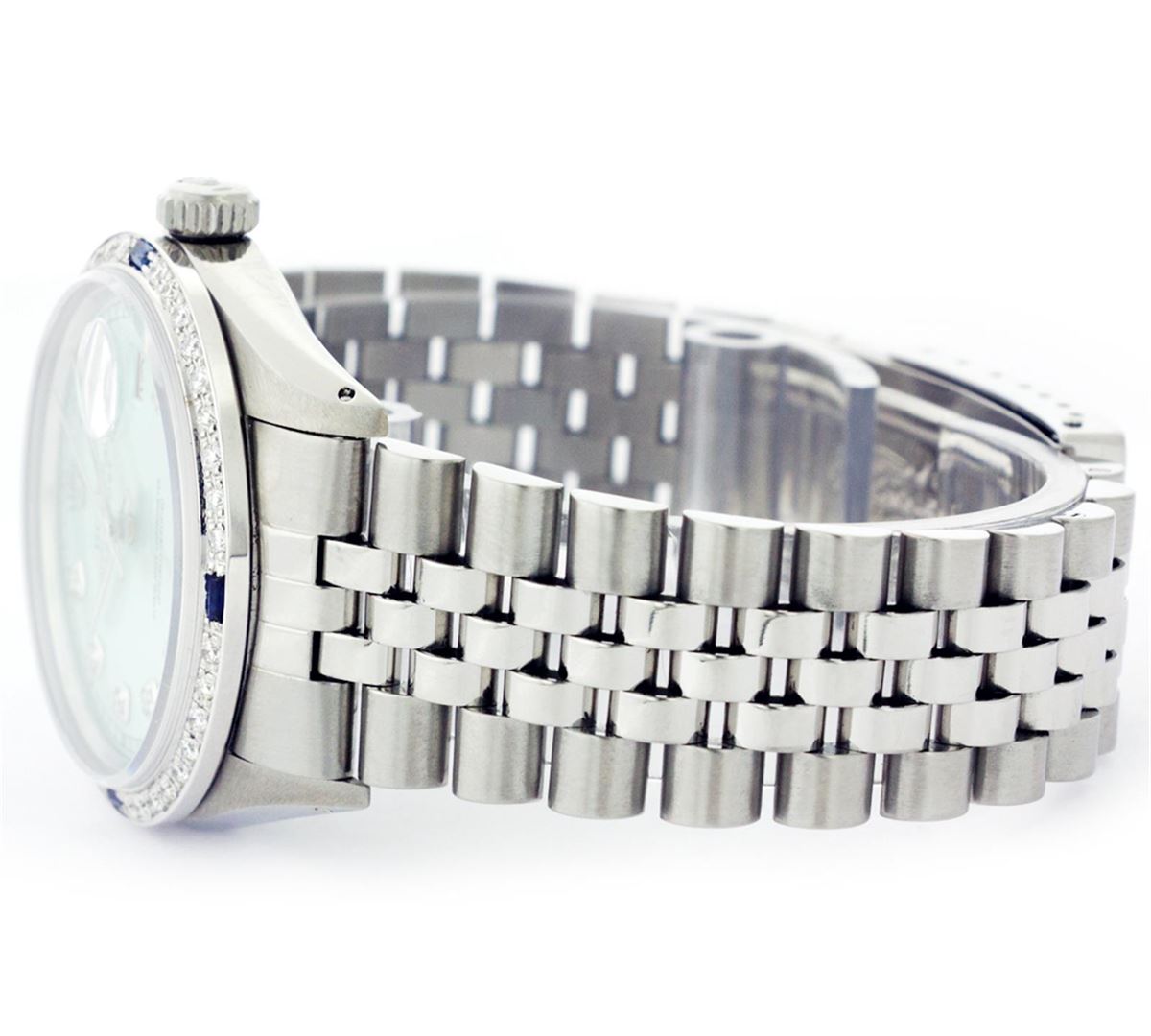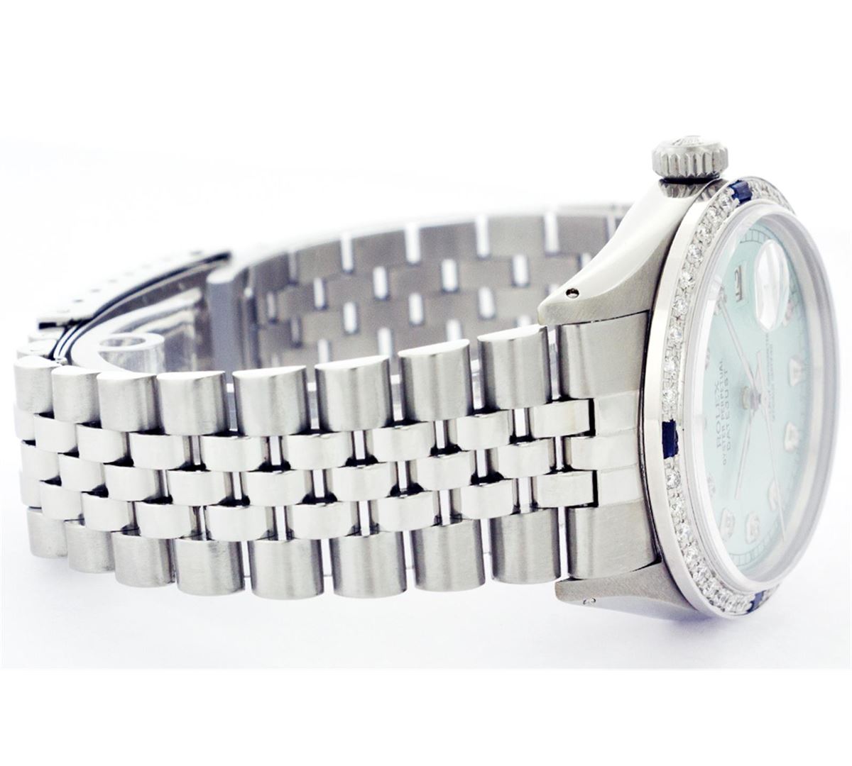 One Gents Rolex Datejust Polished, Serviced & Electronically Tested, Stainless Steel Case:36mm, Stainless Steel Crown, Custom Bezel: 18K White Gold Sapphire Beadset Diamond Bezel, Diamond + Gem Count: 36 Diamonds + 4 Sapphires, Total Weight 1.00 Carat, Clarity: SI-VS, Color: G to H. Crystal: Synthetic Sapphire Cyclops Lens. Movement: Automatic Winding Movement Caliber 3135. Custom Dial: Ice Blue Diamond Dial With Roman Square Track, Diamond Count: 10 Diamonds In Dial, Color: G To H In Color, Clarity: SI-VS. Date Window: 3 O'Clock Position Date Display, Quickset, Model: 16234 Datejust Condition: G-6 Extra Fine. Bracelet: Stainless Steel Jubilee. Bright Polish & Satin Finish. 6.5 Inch Length, Adjustable. Standard Clasp, With Rolex Logo.