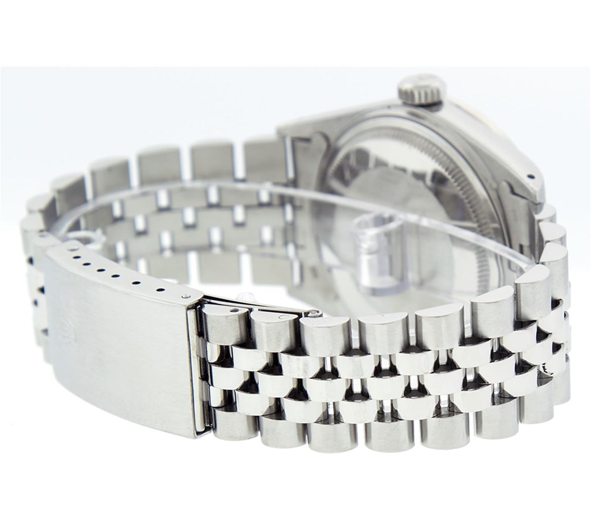 One Mens Rolex Datejust Polished Bright with Satin Finish, Serviced & Electronically Tested, Stainless Steel Case: 36mm, Stainless Steel Crown, Custom Bezel: 18K White Gold Sapphire Beadset Diamond Bezel, Diamond + Gem Count: 36 Diamonds + 4 Sapphires Total Weight 1.00 Carat, Clarity: SI-VS, Color: G to H. Custom Crystal: Synthetic Sapphire Cyclops Lens. Movement: Automatic Winding Movement Caliber 3135. Custom Dial: Slate Grey With Diamond Hour Markers, 10 Diamond Dial G To H In Color, Clarity: SI-VS. Date Window: 3 O'Clock Position Date Display, Quickset, Model: 16234 Condition: G-6 Extra Fine. Bracelet: Stainless Steel Jubilee. Bright Polish & Satin Finish. 6.5 Inch Length, Adjustable. Standard Clasp, With Rolex Logo.