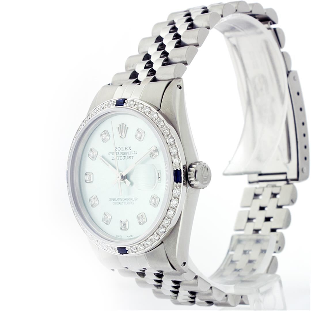 One Gents Stainless Steel Rolex Datejust Polished Bright with Satin Finish, Fully Serviced & Electronically Tested, Stainless Steel Case:36mm, Stainless Steel Crown, Custom Bezel: 18K White Gold Sapphire Beadset Diamond Bezel, Diamond Count: 36 Diamonds + 4 Sapphire, Total Weight 1.00 Carat, Clarity: SI-VS, Color: G to H. Custom Crystal: Synthetic Sapphire Cyclops Lens. Movement: Automatic Winding Movement Caliber 3035. Custom Dial: Ice Blue Diamond Dial, 10 Diamonds in Dial, G To H In Color, Clarity: SI-VS. Date Window: 3 O'Clock Position Date Display, Quickset, Model: Datejust, Condition: G-6 Extra Fine. Bracelet: Stainless Steel Jubilee. Bright Polish & Satin Finish. 6.5 Inch Length, Adjustable. Standard Clasp, With Rolex Logo. Comes with a six month warranty card.