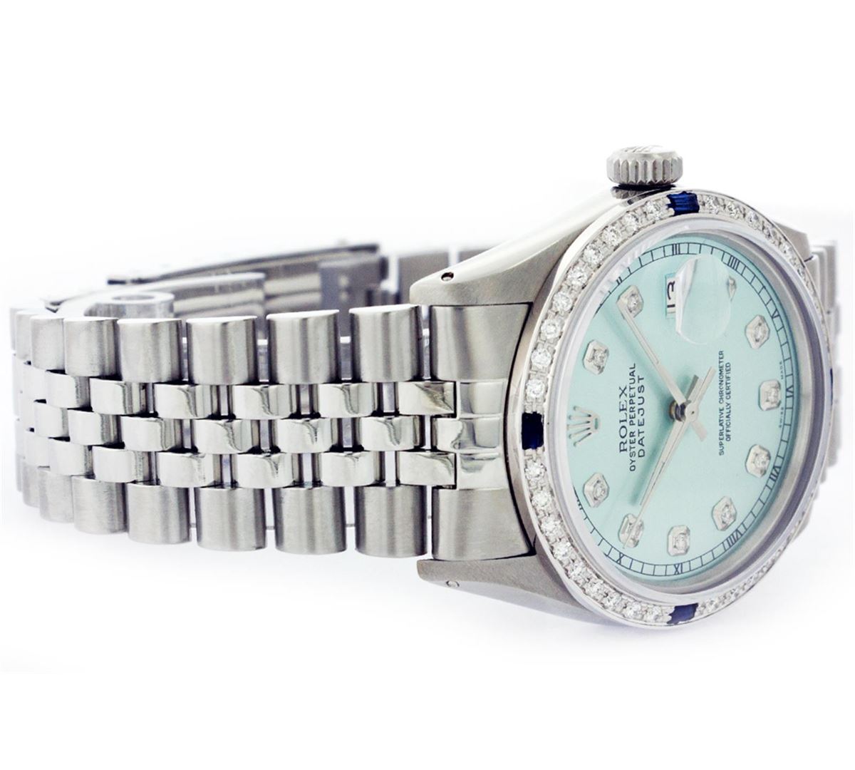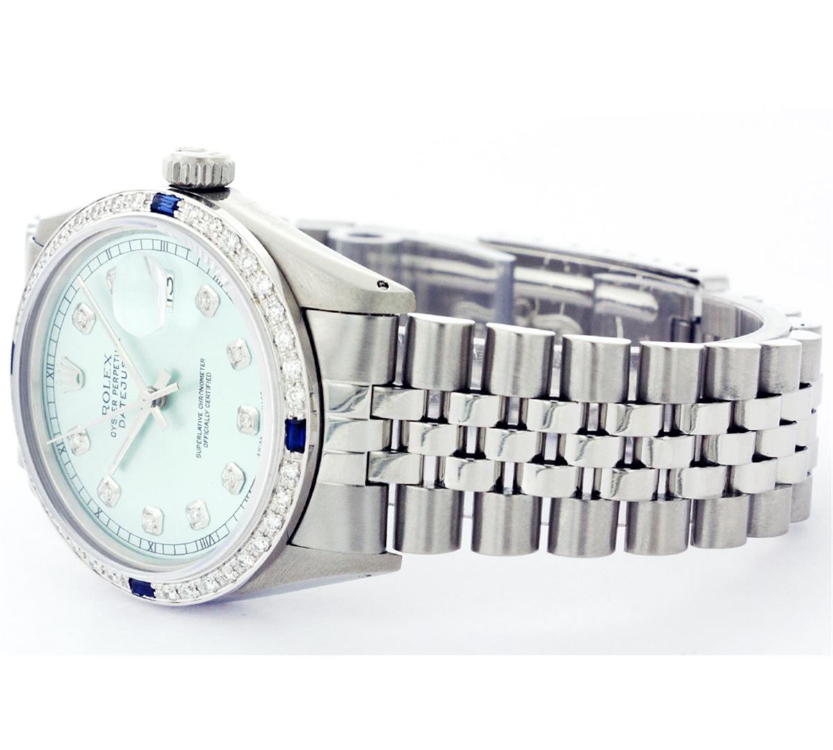 One Gents Rolex Datejust Polished, Serviced & Electronically Tested, Stainless Steel Case:36mm, Stainless Steel Crown, Custom Bezel: 18K White Gold Sapphire Beadset Diamond Bezel, Diamond + Gem Count: 36 Diamonds + 4 Sapphires, Total Weight 1.00 Carat, Clarity: SI-VS, Color: G to H. Crystal: Synthetic Sapphire Cyclops Lens. Movement: Automatic Winding Movement Caliber 3135. Custom Dial: Ice Blue Diamond Dial With Roman Square Track, Diamond Count: 10 Diamonds In Dial, Color: G To H In Color, Clarity: SI-VS. Date Window: 3 O'Clock Position Date Display, Quickset, Model: 16234 Datejust Condition: G-6 Extra Fine. Bracelet: Stainless Steel Jubilee. Bright Polish & Satin Finish. 6.5 Inch Length, Adjustable. Standard Clasp, With Rolex Logo.