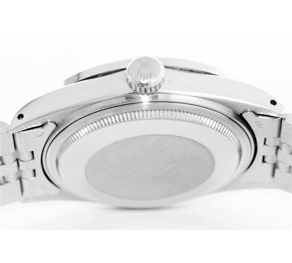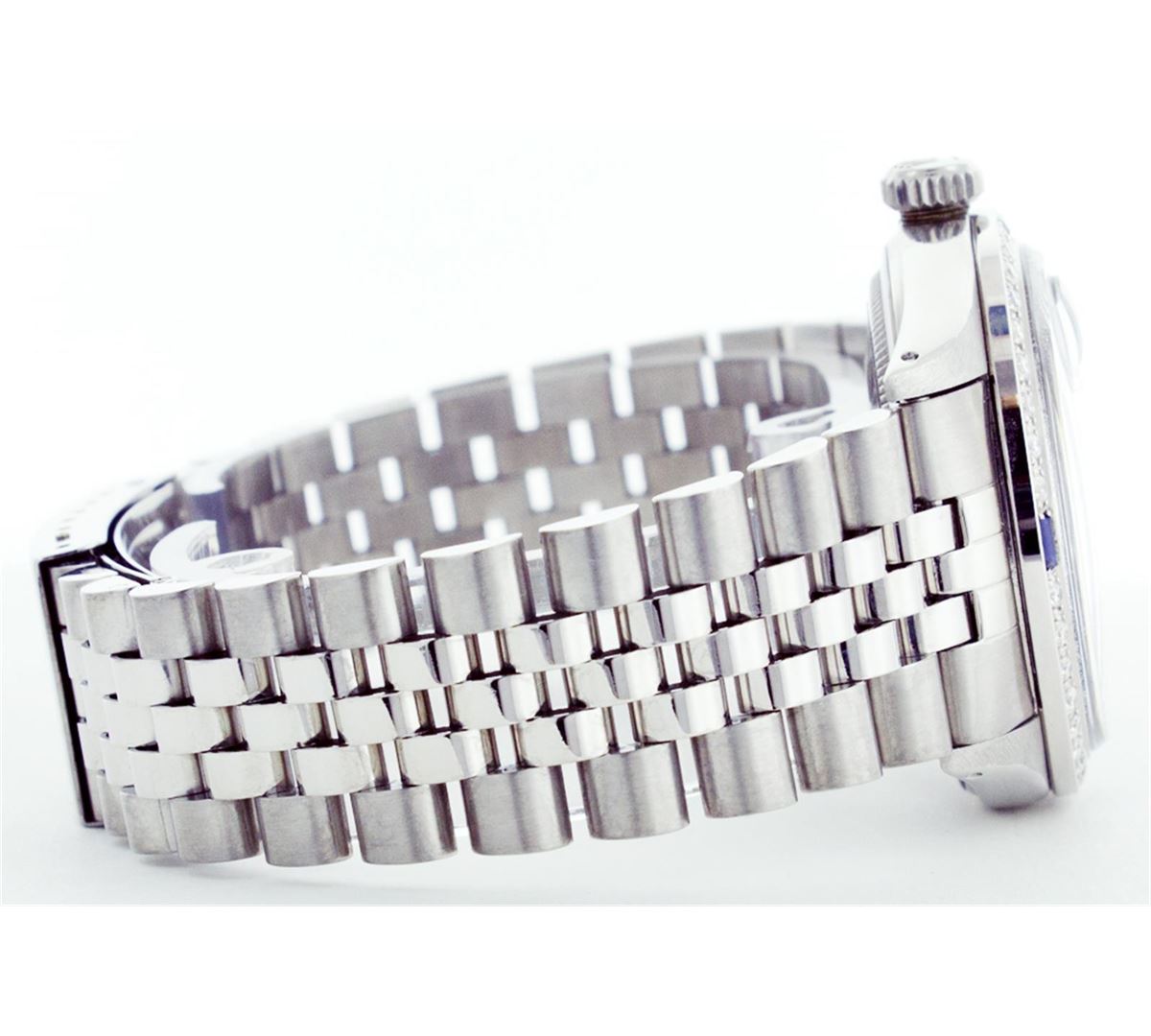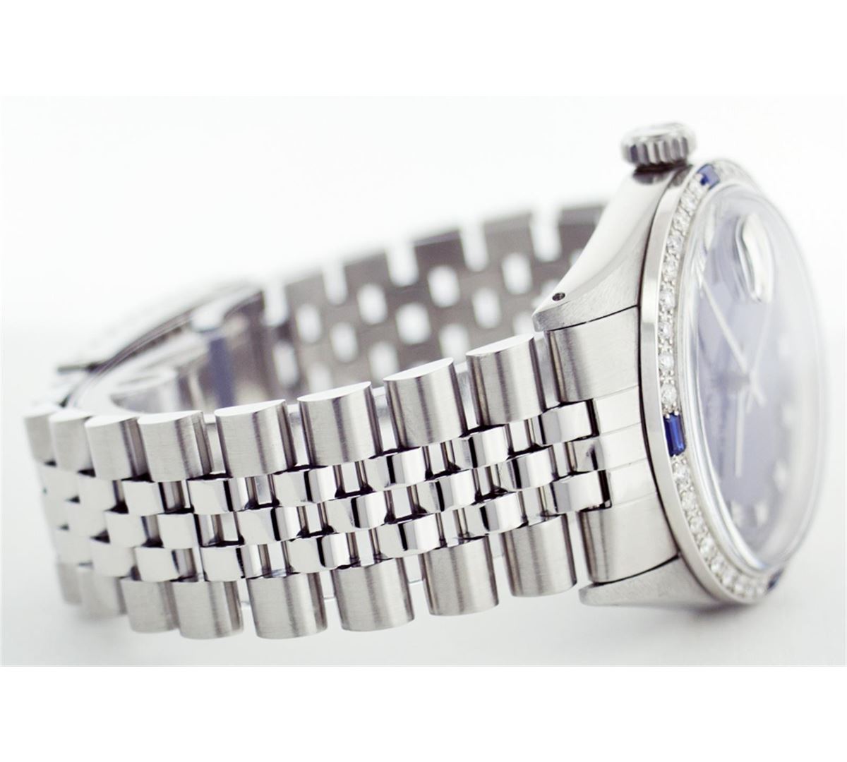 One Mens Rolex Datejust Polished Bright with Satin Finish, Serviced & Electronically Tested, Stainless Steel Case:36mm, Stainless Steel Crown, Custom Bezel: 18K White Gold Sapphire Beadset Diamond Bezel, Diamond Count: 36 Diamonds + 4 Sapphires Total Weight 1.00 Carat, Clarity: SI-VS, Color: G to H. Custom Crystal: Synthetic Sapphire Cyclops Lens. Movement: Automatic Winding Movement Caliber 3035. Original Dial: Blue Vignette With Diamond Hour Markers, 10 Diamond in Dial G To H In Color, Clarity: SI-VS. Date Window: 3 O'Clock Position Date Display, Quickset, Model: 16014 Condition: G-6 Extra Fine. Bracelet: Stainless Steel Jubilee. Bright Polish & Satin Finish. 6.5 Inch Length, Adjustable. Standard Clasp, With Rolex Logo.