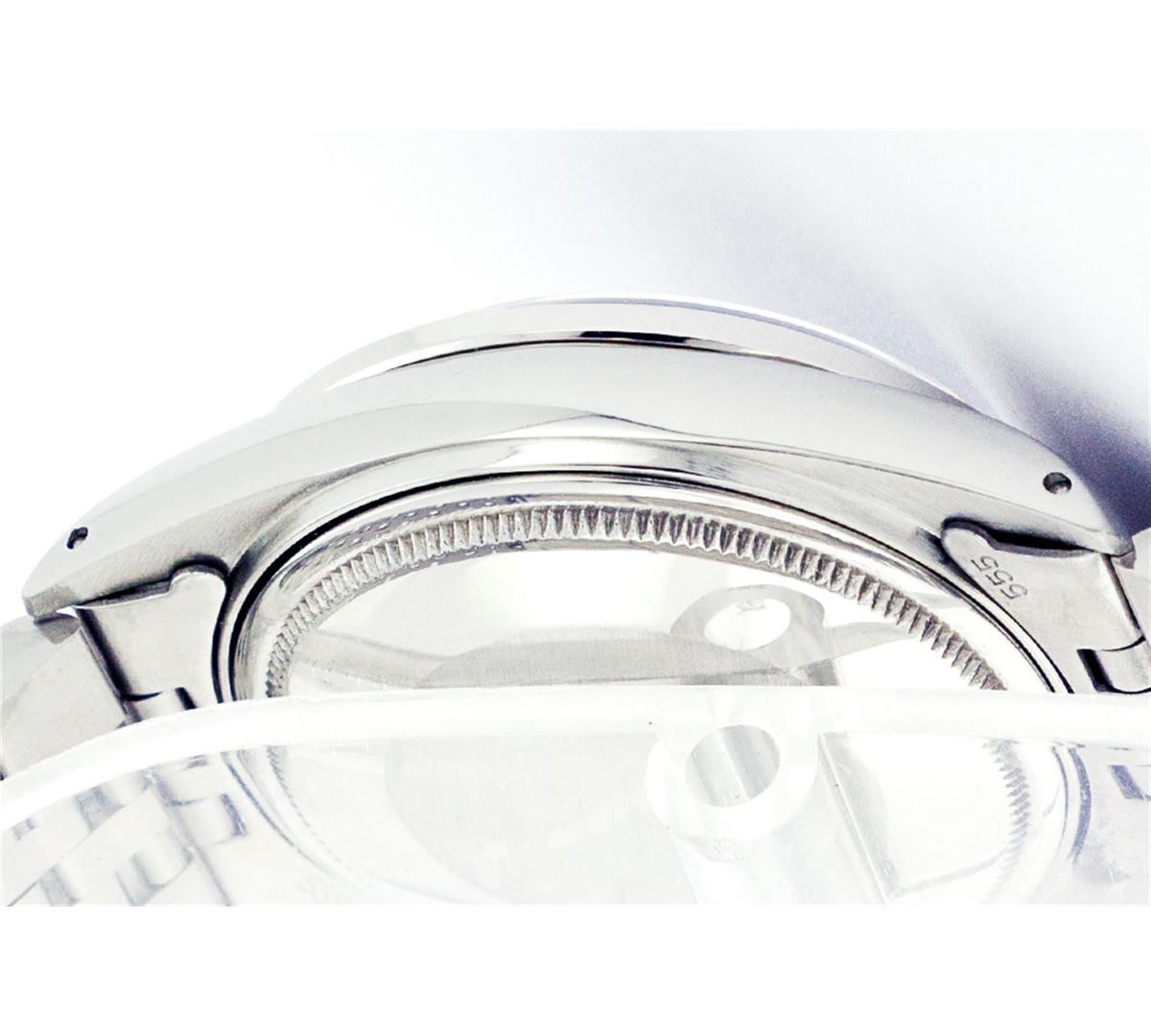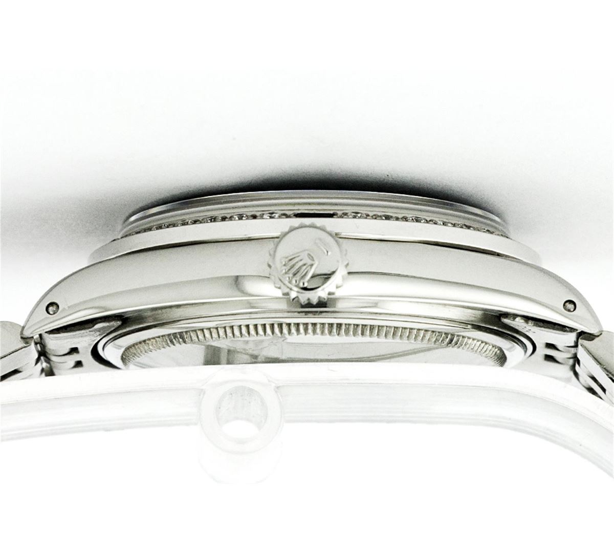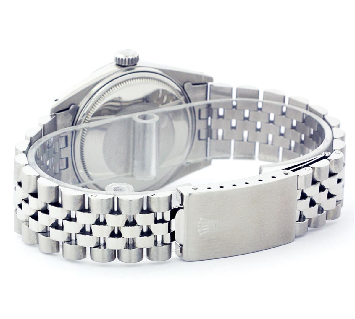 One Mens Rolex Datejust Polished, Serviced & Electronically Tested, Stainless Steel Case:36mm, Stainless Steel Crown, Custom Bezel: 18K White Gold Sapphire Beadset Diamond Bezel, Diamond + Gem Count: 36 Diamonds + 4 Sapphires Total Weight 1.00 Carat, Clarity: SI-VS, Color: G to H. Custom Crystal: Synthetic Sapphire Cyclops Lens. Movement: Automatic Winding Movement Caliber 3035. Custom Dial: Tahitian Mother Of Pearl With String Diamond Dial, Diamond Count: 43 Diamonds In Dial, Clarity: SI-VS, Color: G to H. Date Window: 3 O'Clock Position Date Display, Quickset, Model: 16014 Condition: G-6 Extra Fine. Bracelet: Stainless Steel Jubilee. Bright Polish & Satin Finish. 6.5 Inch Length, Adjustable. Standard Clasp, With Rolex Logo.