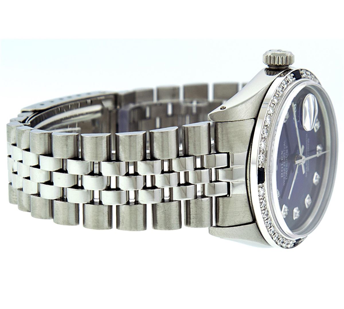 One Mens Rolex Datejust Polished Bright with Satin Finish, Serviced & Electronically Tested, Stainless Steel Case:36mm, Stainless Steel Crown, Custom Bezel: 18K White Gold Sapphire Beadset Diamond Bezel, Diamond + Gem Count: 36 Diamonds + 4 Sapphires Total Weight 1.00 Carat, Clarity: Si-VS, Color: G to H. Crystal: Synthetic Sapphire Cyclops Lens. Movement: Automatic Winding Movement Caliber 3135. Custom Dial: Blue Vignette With Diamond Hour Markers, 10 Diamond in Dial G To H In Color, Si-VS Clarity. Date Window: 3 O'Clock Position Date Display, Quickset, Model: 16234 Condition: G-6 Extra Fine. Bracelet: Stainless Steel Jubilee. Bright Polish & Satin Finish. 6.5 Inch Length, Adjustable. Standard Clasp, With Rolex Logo.