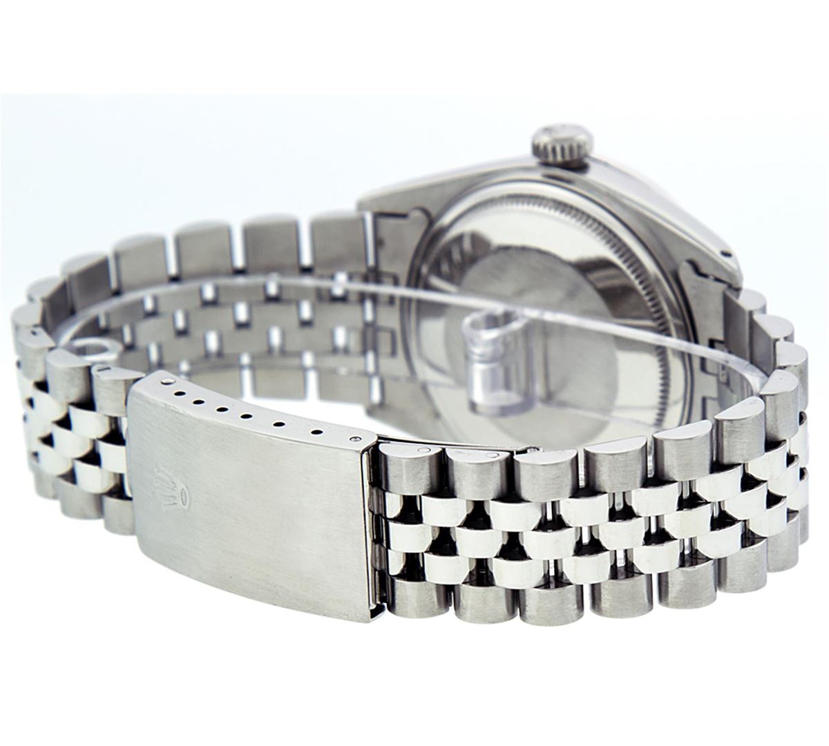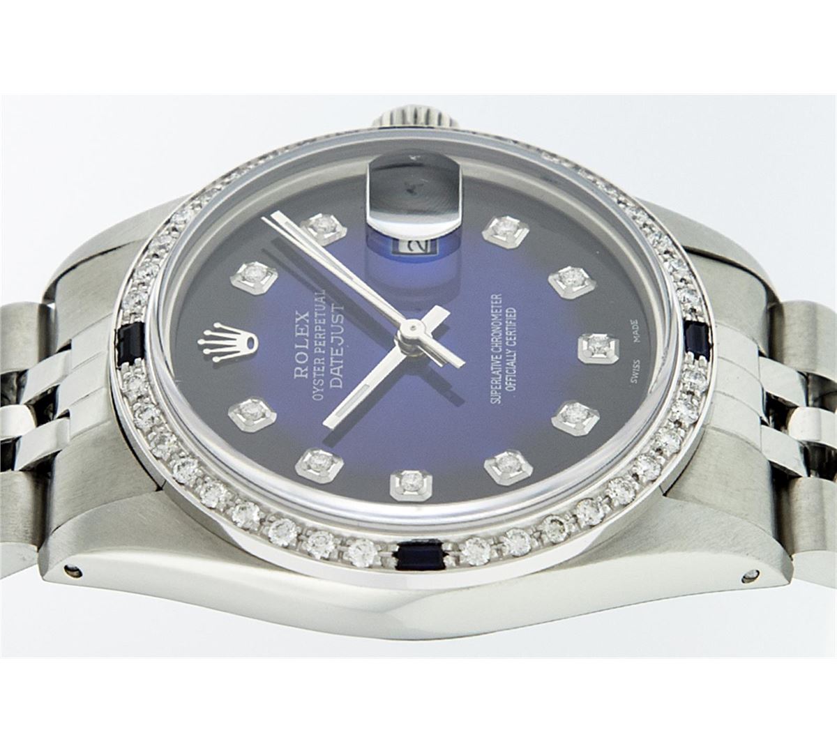 One Mens Rolex Datejust Polished Bright with Satin Finish, Serviced & Electronically Tested, Stainless Steel Case:36mm, Stainless Steel Crown, Custom Bezel: 18K White Gold Sapphire Beadset Diamond Bezel, Diamond + Gem Count: 36 Diamonds + 4 Sapphires Total Weight 1.00 Carat, Clarity: Si-VS, Color: G to H. Crystal: Synthetic Sapphire Cyclops Lens. Movement: Automatic Winding Movement Caliber 3135. Custom Dial: Blue Vignette With Diamond Hour Markers, 10 Diamond in Dial G To H In Color, Si-VS Clarity. Date Window: 3 O'Clock Position Date Display, Quickset, Model: 16234 Condition: G-6 Extra Fine. Bracelet: Stainless Steel Jubilee. Bright Polish & Satin Finish. 6.5 Inch Length, Adjustable. Standard Clasp, With Rolex Logo.