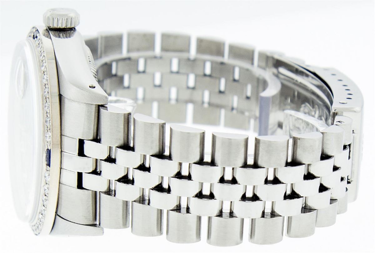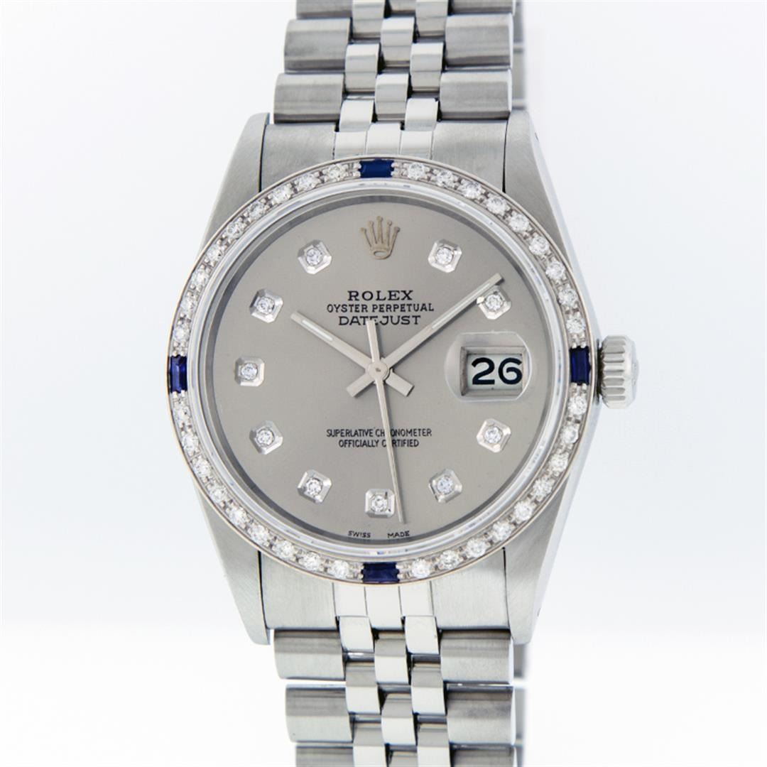 One Mens Rolex Datejust Polished Bright with Satin Finish, Serviced & Electronically Tested, Stainless Steel Case: 36mm, Stainless Steel Crown, Custom Bezel: 18K White Gold Sapphire Beadset Diamond Bezel, Diamond + Gem Count: 36 Diamonds + 4 Sapphires Total Weight 1.00 Carat, Clarity: SI-VS, Color: G to H. Custom Crystal: Synthetic Sapphire Cyclops Lens. Movement: Automatic Winding Movement Caliber 3135. Custom Dial: Slate Grey With Diamond Hour Markers, 10 Diamond Dial G To H In Color, Clarity: SI-VS. Date Window: 3 O'Clock Position Date Display, Quickset, Model: 16234 Condition: G-6 Extra Fine. Bracelet: Stainless Steel Jubilee. Bright Polish & Satin Finish. 6.5 Inch Length, Adjustable. Standard Clasp, With Rolex Logo.