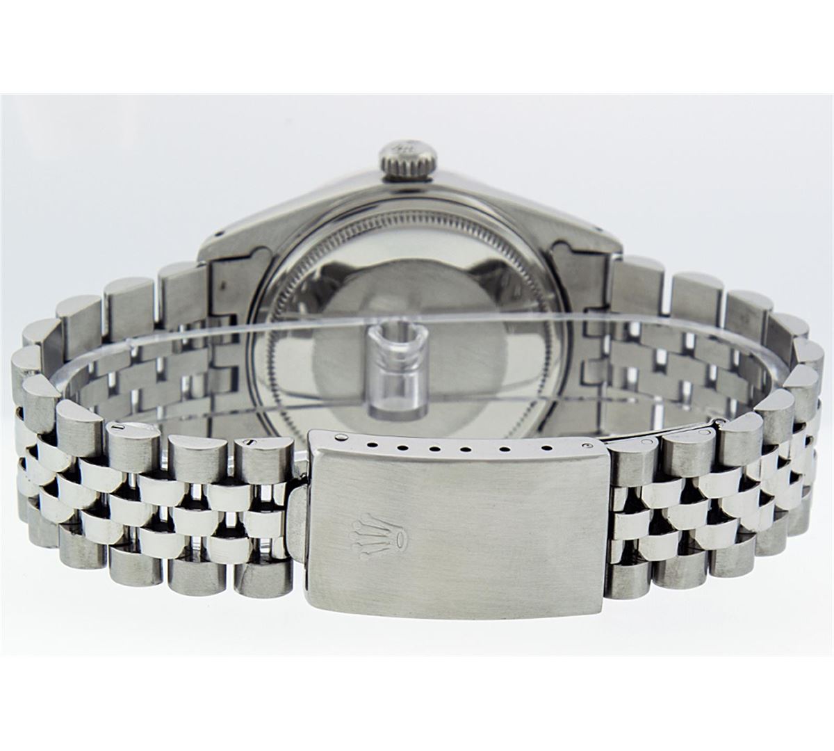 One Mens Rolex Datejust Polished Bright with Satin Finish, Serviced & Electronically Tested, Stainless Steel Case:36mm, Stainless Steel Crown, Custom Bezel: 18K White Gold Sapphire Beadset Diamond Bezel, Diamond + Gem Count: 36 Diamonds + 4 Sapphires Total Weight 1.00 Carat, Clarity: Si-VS, Color: G to H. Crystal: Synthetic Sapphire Cyclops Lens. Movement: Automatic Winding Movement Caliber 3135. Custom Dial: Blue Vignette With Diamond Hour Markers, 10 Diamond in Dial G To H In Color, Si-VS Clarity. Date Window: 3 O'Clock Position Date Display, Quickset, Model: 16234 Condition: G-6 Extra Fine. Bracelet: Stainless Steel Jubilee. Bright Polish & Satin Finish. 6.5 Inch Length, Adjustable. Standard Clasp, With Rolex Logo.