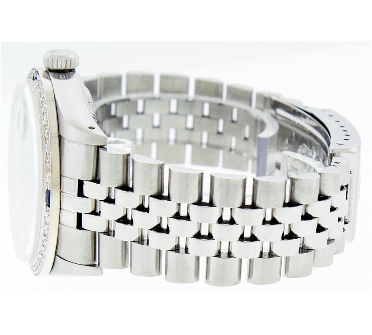 One Mens Rolex Datejust Polished Bright with Satin Finish, Serviced & Electronically Tested, Stainless Steel Case: 36mm, Stainless Steel Crown, Custom Bezel: 18K White Gold Sapphire Beadset Diamond Bezel, Diamond + Gem Count: 36 Diamonds + 4 Sapphires Total Weight 1.00 Carat, Clarity: SI-VS, Color: G to H. Custom Crystal: Synthetic Sapphire Cyclops Lens. Movement: Automatic Winding Movement Caliber 3135. Custom Dial: Slate Grey With Diamond Hour Markers, 10 Diamond Dial G To H In Color, Clarity: SI-VS. Date Window: 3 O'Clock Position Date Display, Quickset, Model: 16234 Condition: G-6 Extra Fine. Bracelet: Stainless Steel Jubilee. Bright Polish & Satin Finish. 6.5 Inch Length, Adjustable. Standard Clasp, With Rolex Logo.