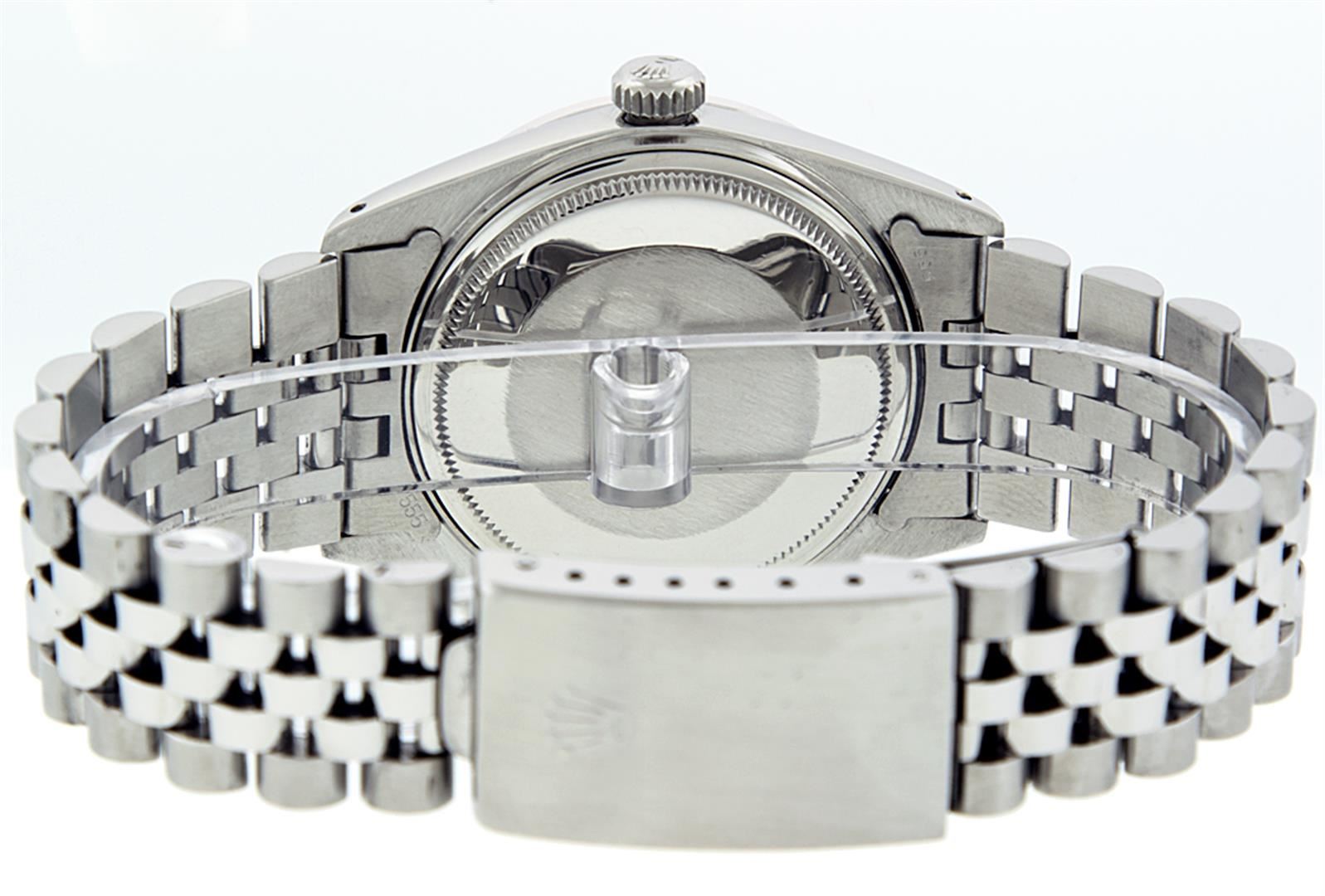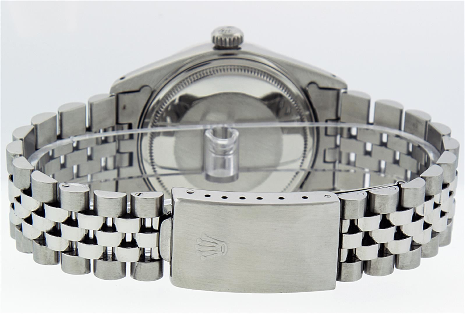 One Mens Rolex Datejust Polished Bright with Satin Finish, Serviced & Electronically Tested, Stainless Steel Case:36mm, Stainless Steel Crown, Custom Bezel: 18K White Gold Sapphire Beadset Diamond Bezel, Diamond + Gem Count: 36 Diamonds + 4 Sapphires Total Weight 1.00 Carat, Clarity: Si-VS, Color: G to H. Crystal: Synthetic Sapphire Cyclops Lens. Movement: Automatic Winding Movement Caliber 3135. Custom Dial: Blue Vignette With Diamond Hour Markers, 10 Diamond in Dial G To H In Color, Si-VS Clarity. Date Window: 3 O'Clock Position Date Display, Quickset, Model: 16234 Condition: G-6 Extra Fine. Bracelet: Stainless Steel Jubilee. Bright Polish & Satin Finish. 6.5 Inch Length, Adjustable. Standard Clasp, With Rolex Logo.