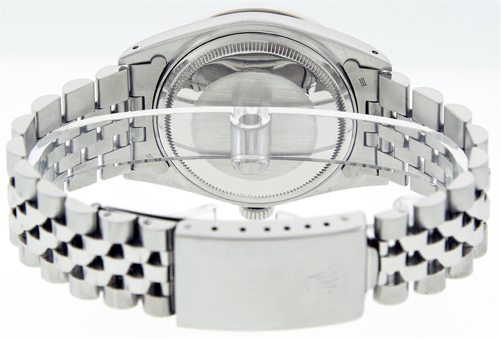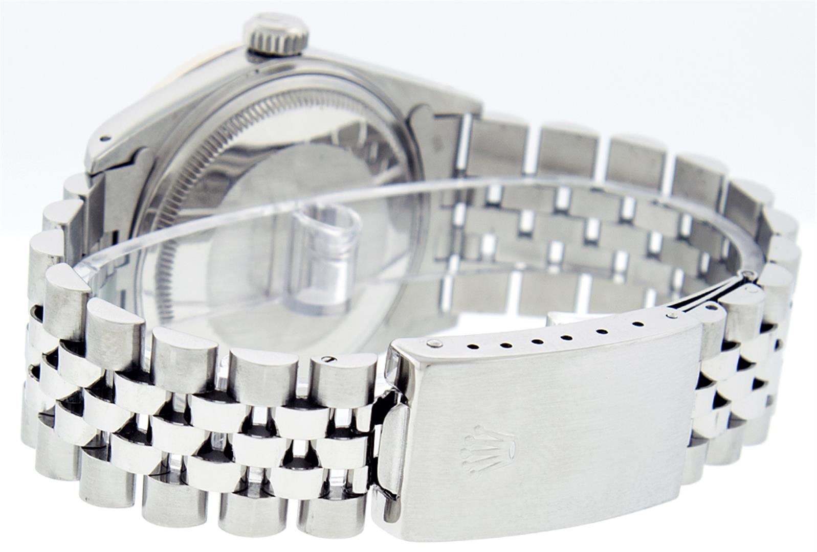 One Mens Rolex Datejust Polished Bright with Satin Finish, Serviced & Electronically Tested, Stainless Steel Case: 36mm, Stainless Steel Crown, Custom Bezel: 18K White Gold Sapphire Beadset Diamond Bezel, Diamond + Gem Count: 36 Diamonds + 4 Sapphires Total Weight 1.00 Carat, Clarity: SI-VS, Color: G to H. Custom Crystal: Synthetic Sapphire Cyclops Lens. Movement: Automatic Winding Movement Caliber 3135. Custom Dial: Slate Grey With Diamond Hour Markers, 10 Diamond Dial G To H In Color, Clarity: SI-VS. Date Window: 3 O'Clock Position Date Display, Quickset, Model: 16234 Condition: G-6 Extra Fine. Bracelet: Stainless Steel Jubilee. Bright Polish & Satin Finish. 6.5 Inch Length, Adjustable. Standard Clasp, With Rolex Logo.
