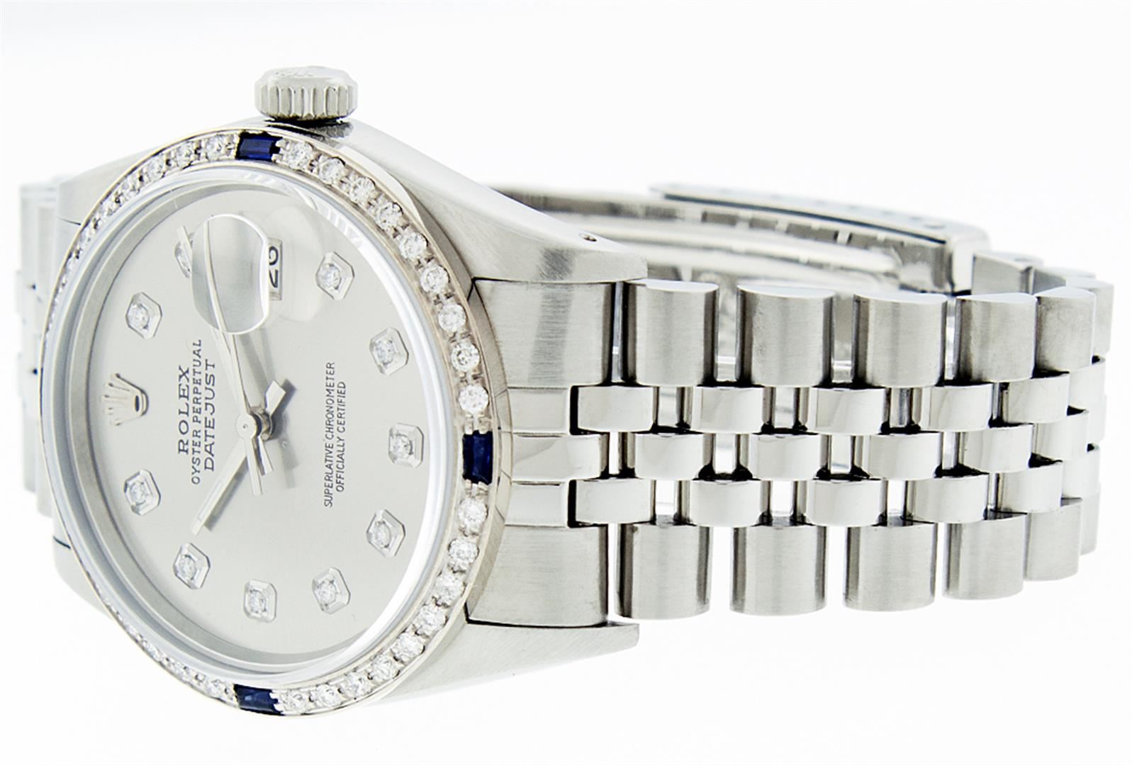 One Mens Rolex Datejust Polished Bright with Satin Finish, Serviced & Electronically Tested, Stainless Steel Case: 36mm, Stainless Steel Crown, Custom Bezel: 18K White Gold Sapphire Beadset Diamond Bezel, Diamond + Gem Count: 36 Diamonds + 4 Sapphires Total Weight 1.00 Carat, Clarity: SI-VS, Color: G to H. Custom Crystal: Synthetic Sapphire Cyclops Lens. Movement: Automatic Winding Movement Caliber 3135. Custom Dial: Slate Grey With Diamond Hour Markers, 10 Diamond Dial G To H In Color, Clarity: SI-VS. Date Window: 3 O'Clock Position Date Display, Quickset, Model: 16234 Condition: G-6 Extra Fine. Bracelet: Stainless Steel Jubilee. Bright Polish & Satin Finish. 6.5 Inch Length, Adjustable. Standard Clasp, With Rolex Logo.