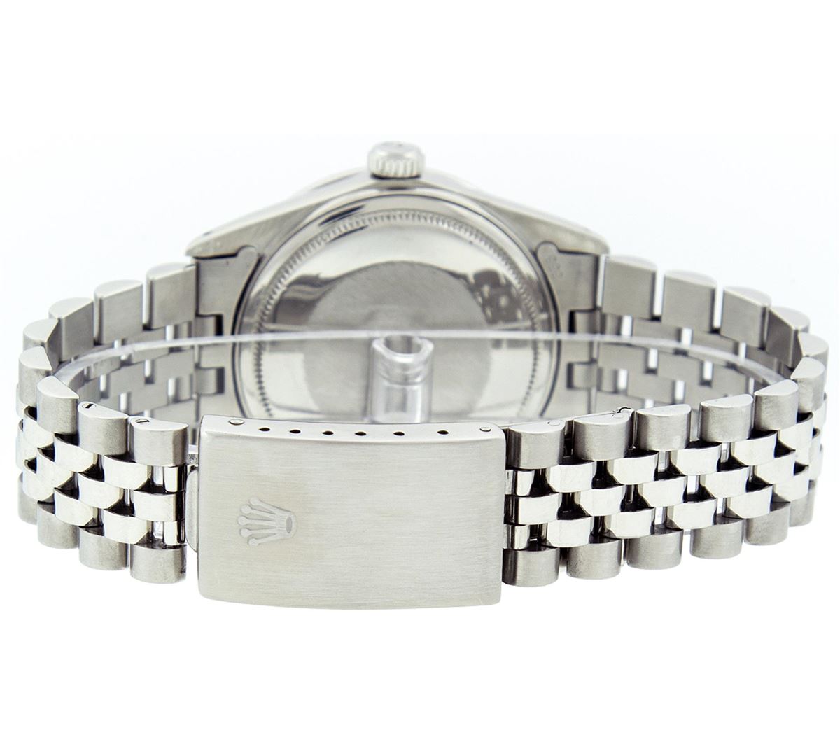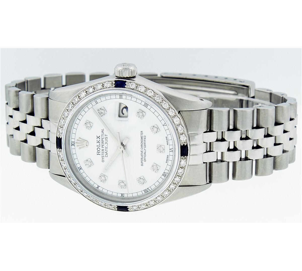One Mens Rolex Datejust Polished Bright with Satin Finish, Serviced & Electronically Tested, Stainless Steel Case:36mm, Stainless Steel Crown, Custom Bezel: 18K White Gold Sapphire Beadset Diamond Bezel, Diamond + Gem Count: 36 Diamonds + 4 Sapphires. Total Weight 1.00 Carat, Clarity: Si-VS, Color: G to H. Custom Crystal: Synthetic Sapphire Cyclops Lens. Movement: Automatic Winding Movement Caliber 3035. Custom Dial: White Diamond Dial With Square Roman Track, Diamond Count: 10 Diamonds Square Setting, Color: G to H, Clarity: SI-VS.. Date Window: 3 O'Clock Position Date Display, Quickset, Model: Datejust. Condition: G-6 Extra Fine. Bracelet: Stainless Steel Jubilee. Bright Polish & Satin Finish. 7.0 Inch Length, Adjustable. Standard Clasp, With Rolex Logo. Comes with 6 month warranty.