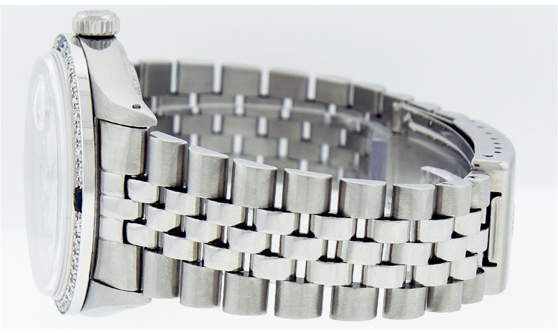 One Mens Rolex Datejust Polished Bright with Satin Finish, Serviced & Electronically Tested, Stainless Steel Case:36mm, Stainless Steel Crown, Custom Bezel: 18K White Gold Sapphire Beadset Diamond Bezel, Diamond + Gem Count: 36 Diamonds + 4 Sapphires. Total Weight 1.00 Carat, Clarity: Si-VS, Color: G to H. Custom Crystal: Synthetic Sapphire Cyclops Lens. Movement: Automatic Winding Movement Caliber 3035. Custom Dial: White Diamond Dial With Square Roman Track, Diamond Count: 10 Diamonds Square Setting, Color: G to H, Clarity: SI-VS.. Date Window: 3 O'Clock Position Date Display, Quickset, Model: Datejust. Condition: G-6 Extra Fine. Bracelet: Stainless Steel Jubilee. Bright Polish & Satin Finish. 7.0 Inch Length, Adjustable. Standard Clasp, With Rolex Logo. Comes with 6 month warranty.
