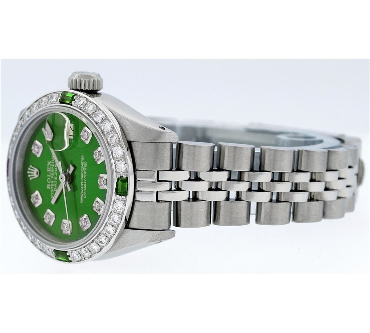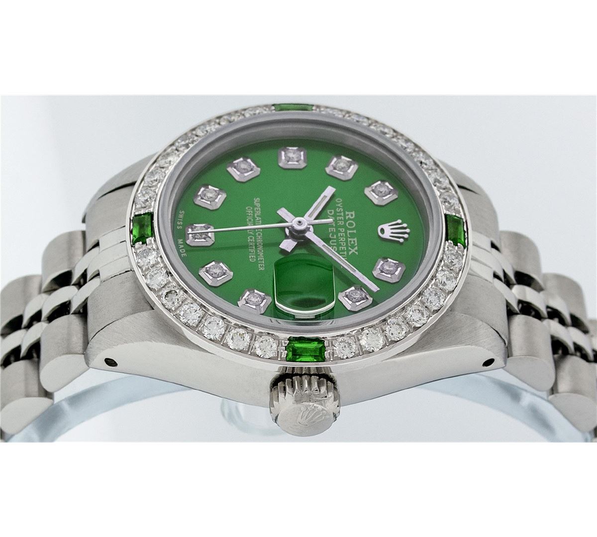 Ladies Rolex Datejust Polished Bright with Satin Finish, Serviced & Electronically Tested, Stainless Steel Case:26mm, Stainless Steel Crown, Custom Bezel: 18K White Gold Emerald Beadset Diamond Bezel, Diamond + Gem Count: 28 Diamonds + 4 Emeralds Total Weight .70 Carat, Clarity: SI-VS, Color: G to H. Custom Crystal: Synthetic Sapphire Cyclops Lens. Movement: Automatic Winding Movement Caliber 2030. Custom Dial: Refinished Green Diamond Dial. Diamond Count: 10 Diamonds In Dial, Color: G To H, VS SI1. Date Window: 3 O'Clock Position Date Display, Model: Datejust Condition: G-6 Extra Fine. Bracelet: Stainless Steel Jubilee. Bright Polish & Satin Finish. 6.0 Inch Length, Adjustable. Standard Clasp, With Rolex Logo.