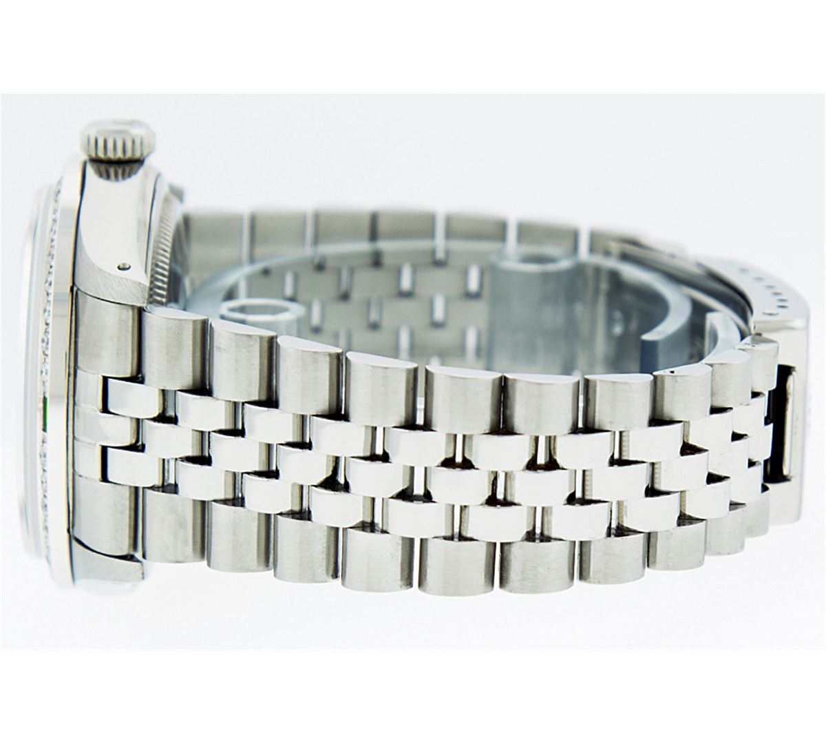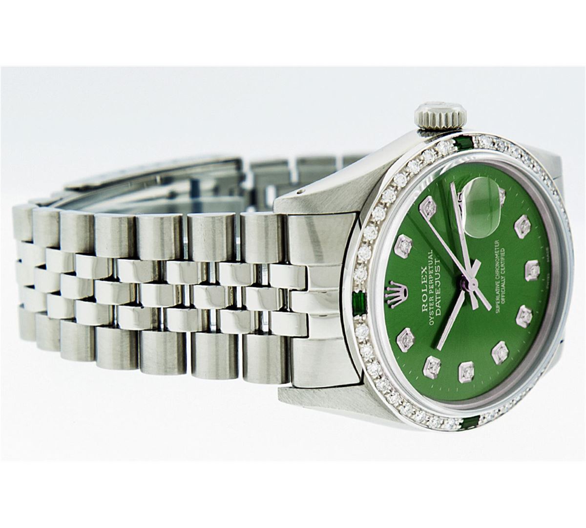 One Gents Rolex Datejust Polished, Serviced & Electronically Tested, Stainless Steel Case:36mm, Stainless Steel Crown, Custom Bezel: 18K White Gold Emerald Beadset Diamond Bezel, Diamond + Gem Count: 36 Diamonds + 4 Emeralds Total Weight 1.00 Carat, Clarity: SI-VS, Color: G to H. Custom Crystal: Synthetic Sapphire Cyclops Lens. Movement: Automatic Winding Movement Caliber 3035. Custom Dial: Green With Diamond Hour Markers, 10 Diamond Dial G To H In Color, Clarity: SI-VS. Date Window: 3 O'Clock Position Date Display, Quickset, Model: Datejust, Condition: G-6 Extra Fine. Bracelet: Stainless Steel Jubilee. Bright Polish & Satin Finish. 7.0 Inch Length, Adjustable. Standard Clasp, With Rolex Logo Comes with a 6 month warranty card.