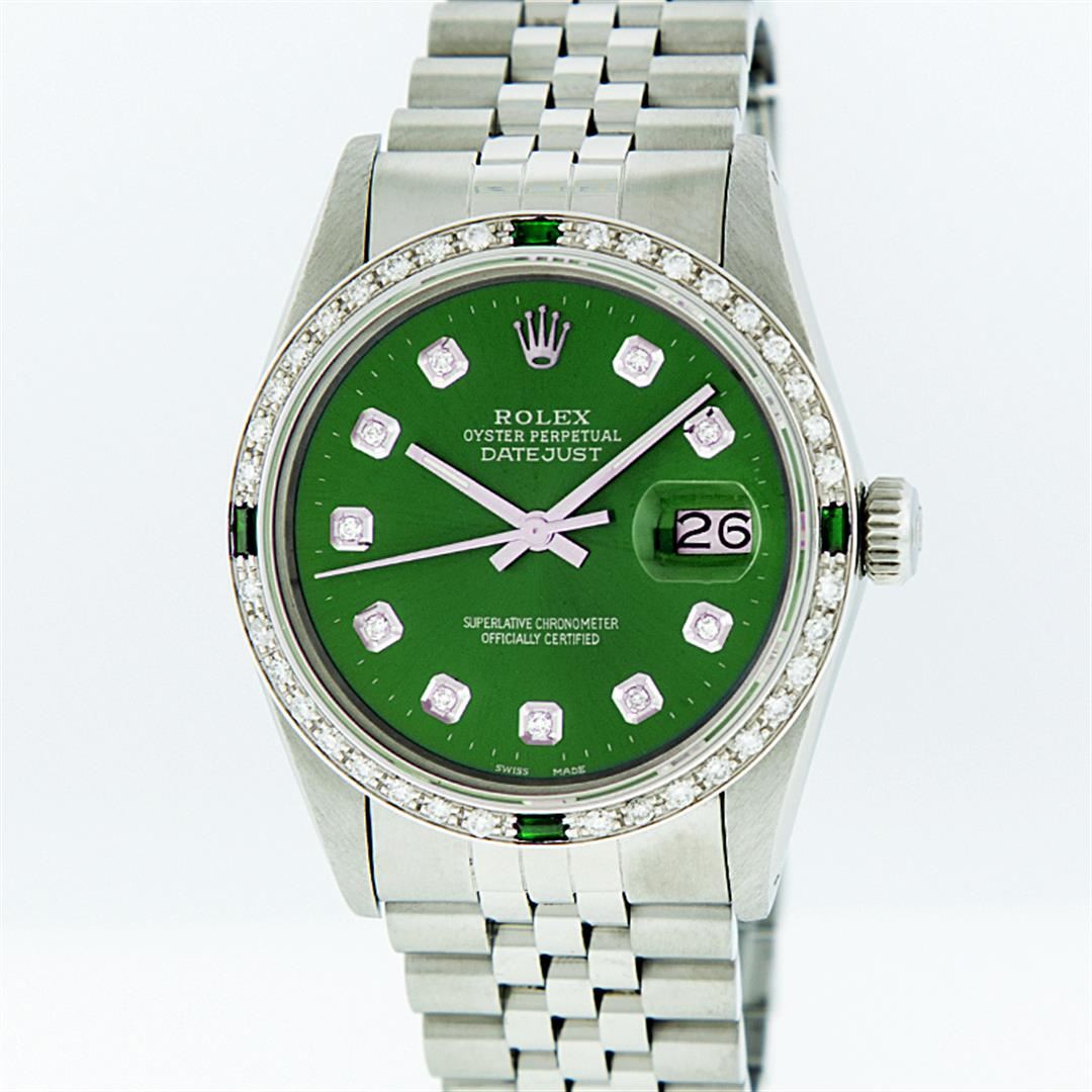 One Gents Rolex Datejust Polished, Serviced & Electronically Tested, Stainless Steel Case:36mm, Stainless Steel Crown, Custom Bezel: 18K White Gold Emerald Beadset Diamond Bezel, Diamond + Gem Count: 36 Diamonds + 4 Emeralds Total Weight 1.00 Carat, Clarity: SI-VS, Color: G to H. Custom Crystal: Synthetic Sapphire Cyclops Lens. Movement: Automatic Winding Movement Caliber 3035. Custom Dial: Green With Diamond Hour Markers, 10 Diamond Dial G To H In Color, Clarity: SI-VS. Date Window: 3 O'Clock Position Date Display, Quickset, Model: Datejust, Condition: G-6 Extra Fine. Bracelet: Stainless Steel Jubilee. Bright Polish & Satin Finish. 7.0 Inch Length, Adjustable. Standard Clasp, With Rolex Logo Comes with a 6 month warranty card.