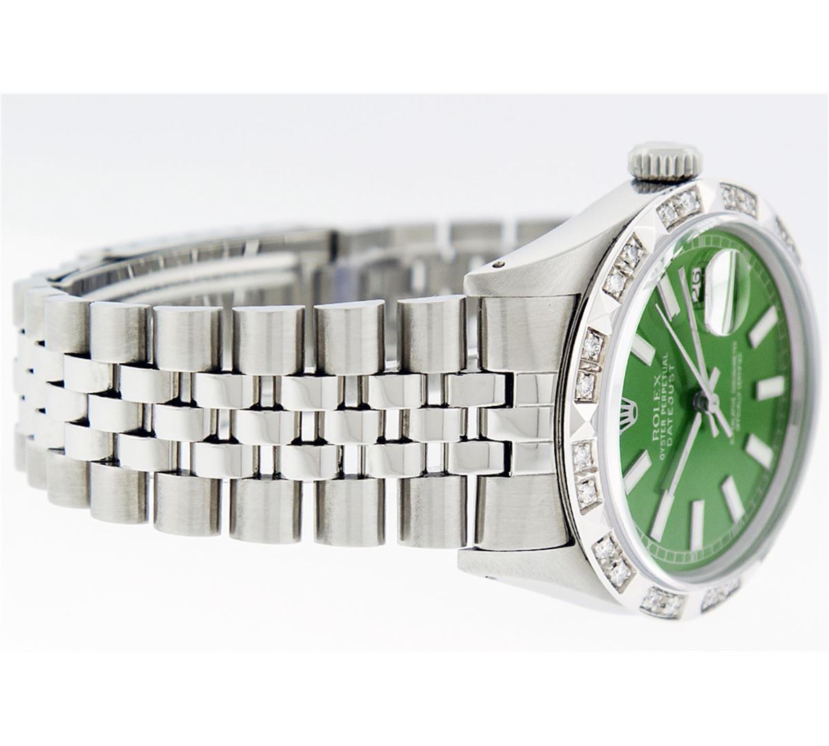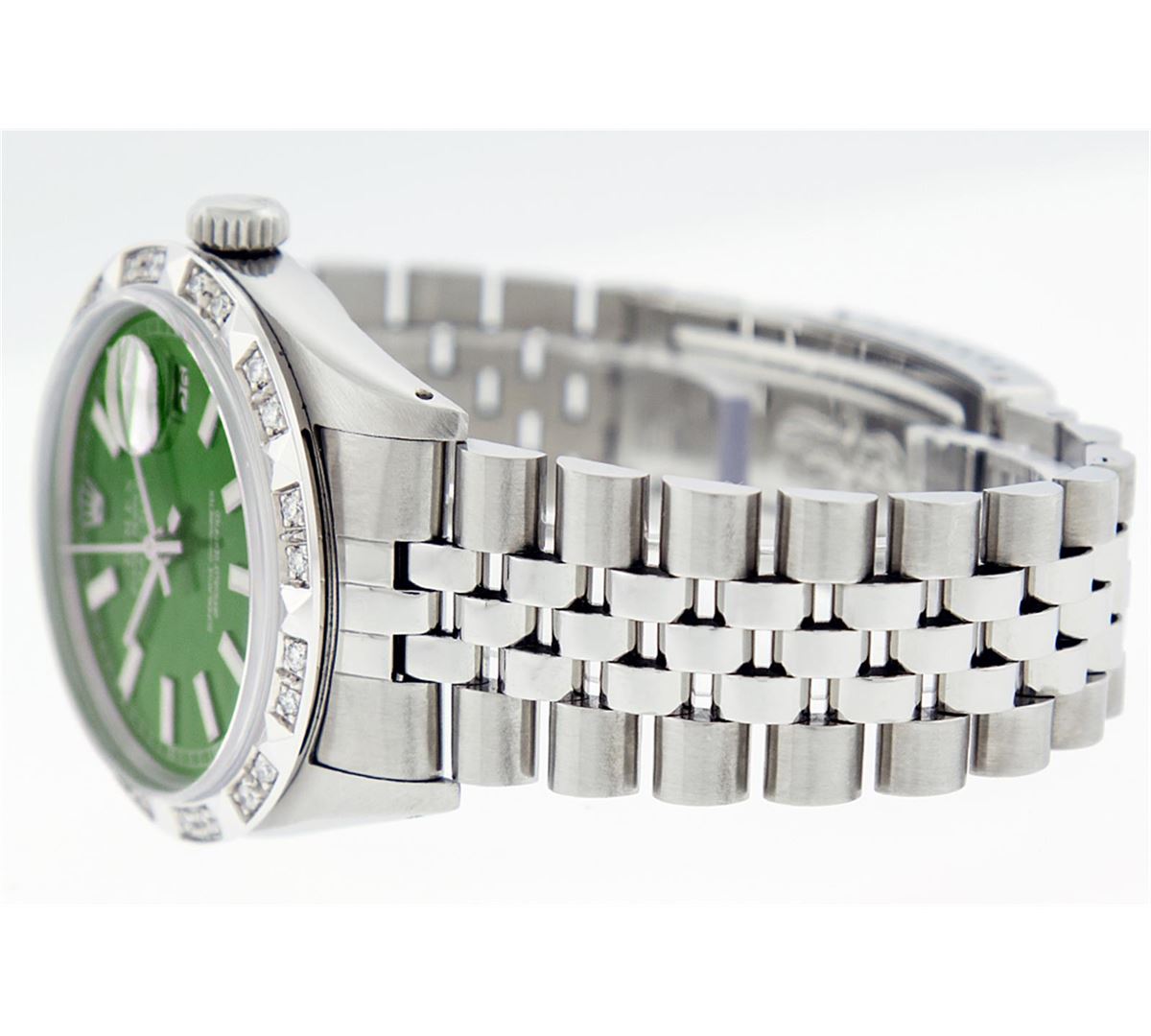 One Mens Rolex Datejust Polished Bright with Satin Finish, Serviced & Electronically Tested, Stainless Steel Case:36mm, Stainless Steel Crown, Custom Bezel: 18K White Gold Pyramid Diamond Bezel, Diamond Count: 24 Diamonds Total Weight .70 Carat, Clarity: SI-VS, Color: G to H. Custom Crystal: Synthetic Sapphire Cyclops Lens. Movement: Automatic Winding Movement Caliber 3035. Custom Dial: Green Index Dial. Date Window: 3 O'Clock Position Date Display, Quickset, Model: Datejust, Condition: G-6 Extra Fine. Bracelet: Stainless Steel Jubilee. Bright Polish & Satin Finish. 7.0 Inch Length, Adjustable. Standard Clasp, With Rolex Logo. Comes with a 6 month warranty card.
